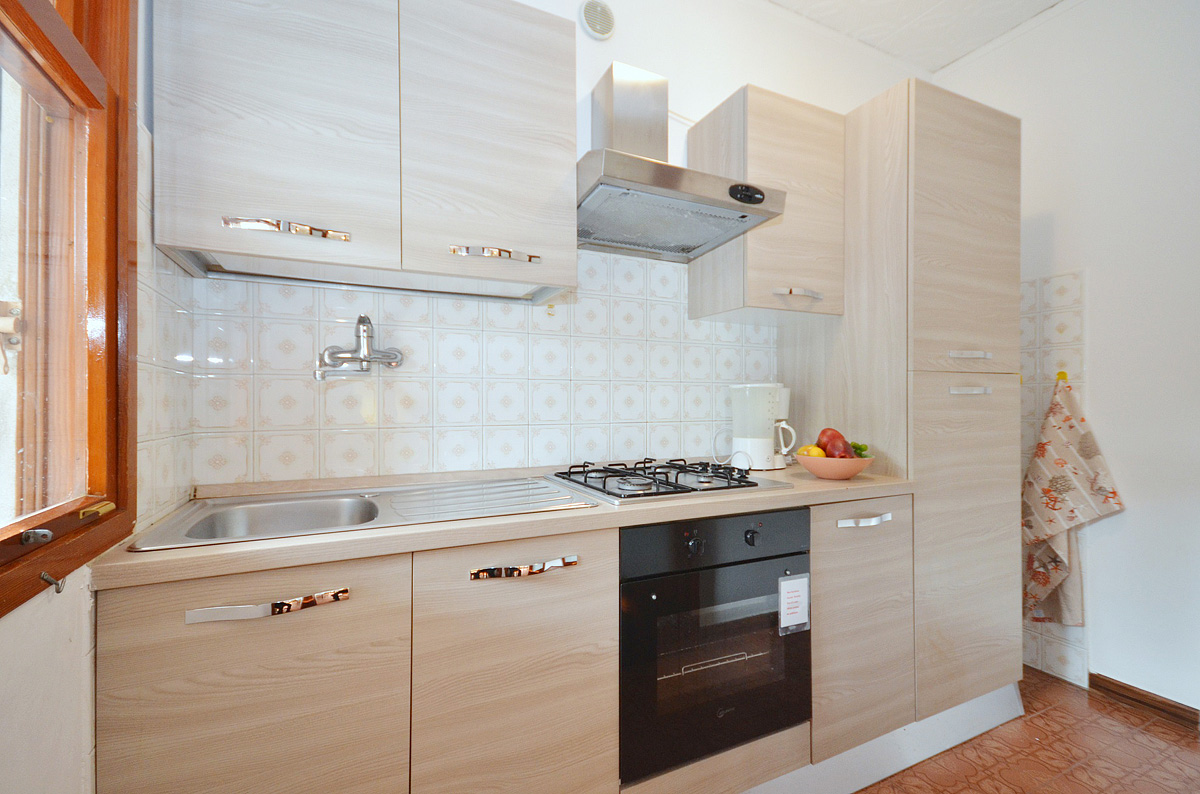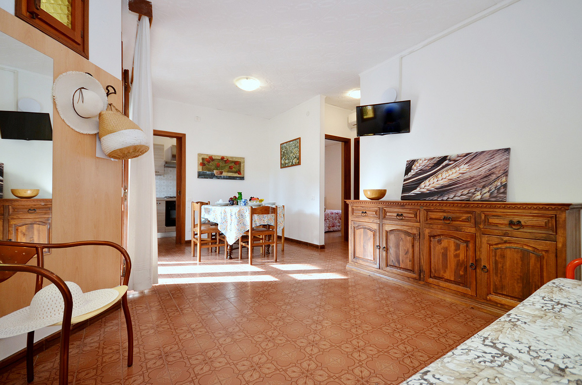 45 až 50 m² - patro: obývací pokoj s kuchyňským koutem a rozkládacím gaučem pro 2 osobu (možno i typ „šuplík“), 2 ložnice s manželskou postelí, sociální zařízení se sprchou, terasa, krb, garážové stání (výška 1,8 m); oplocená předzahrádka, částečně renovovaný apartmán