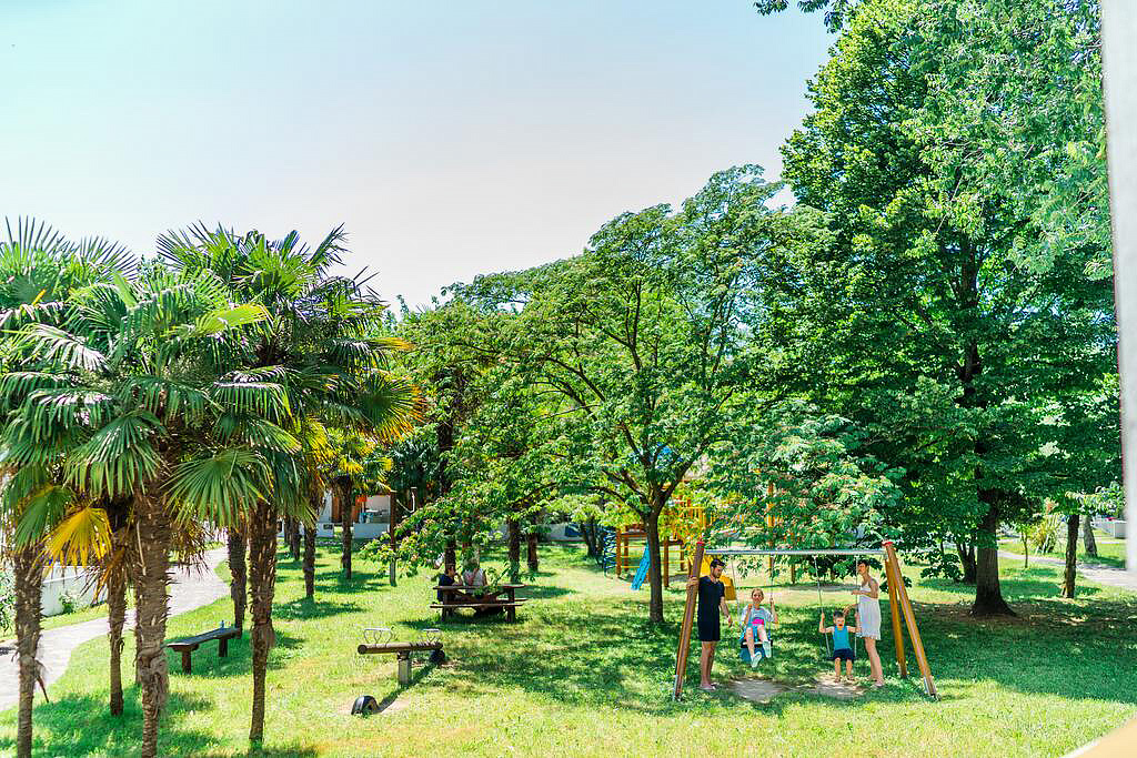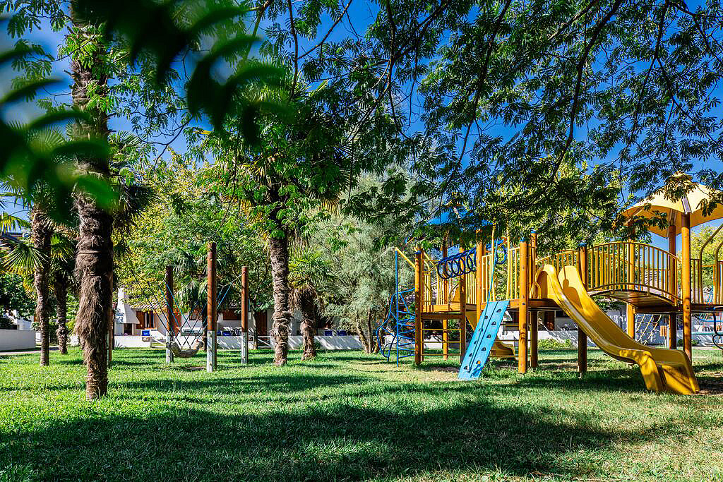 venkovní bazén s vodopádovou fontánou, blahodárnou hydromasáží pro záda a krk a dětský vyhřívaný bazén se skluzavkou, lehátka a slunečníky, tenisové kurty s antukou, beach volejbalové kurty, fitness / wellness zóna se saunou a tureckými lázněmi*, ping pong; plážový servis (1 slunečník a 2 lehátka) v ceně bungalovu typu trilo 4 – classic a trilo 4 – superior, u typu trilo 4 – basic za příplatek