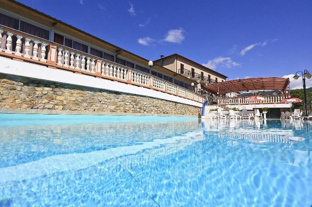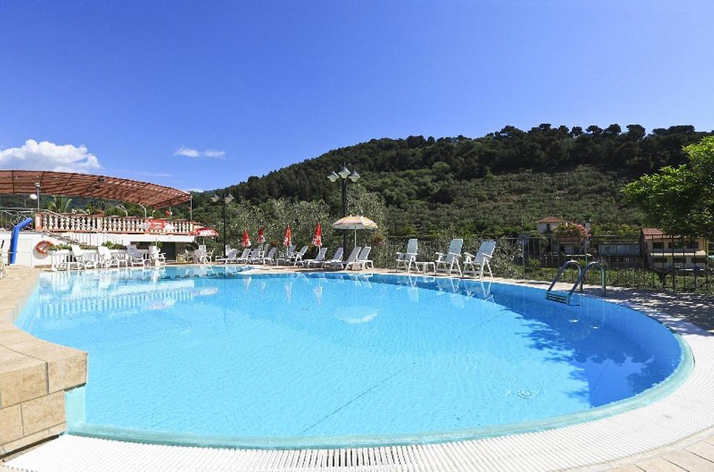 bazén (19 x 18 m) s dětskou částí, lehátky a slunečníky
