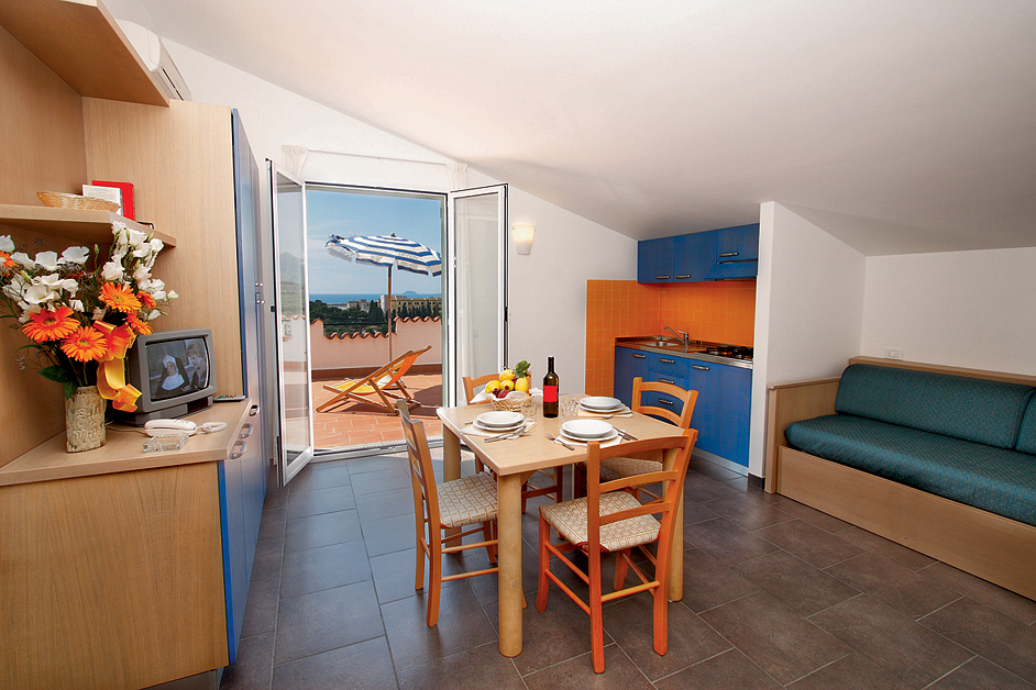 45 m² - ložnice s manželskou postelí a vysunovacím či skládacím lůžkem, obývací pokoj s kuchyňským koutem, rozkládacím gaučem pro 1 osobu a vysunovacím či skládacím lůžkem, sociální zařízení se sprchou či vanou, balkon či terasa