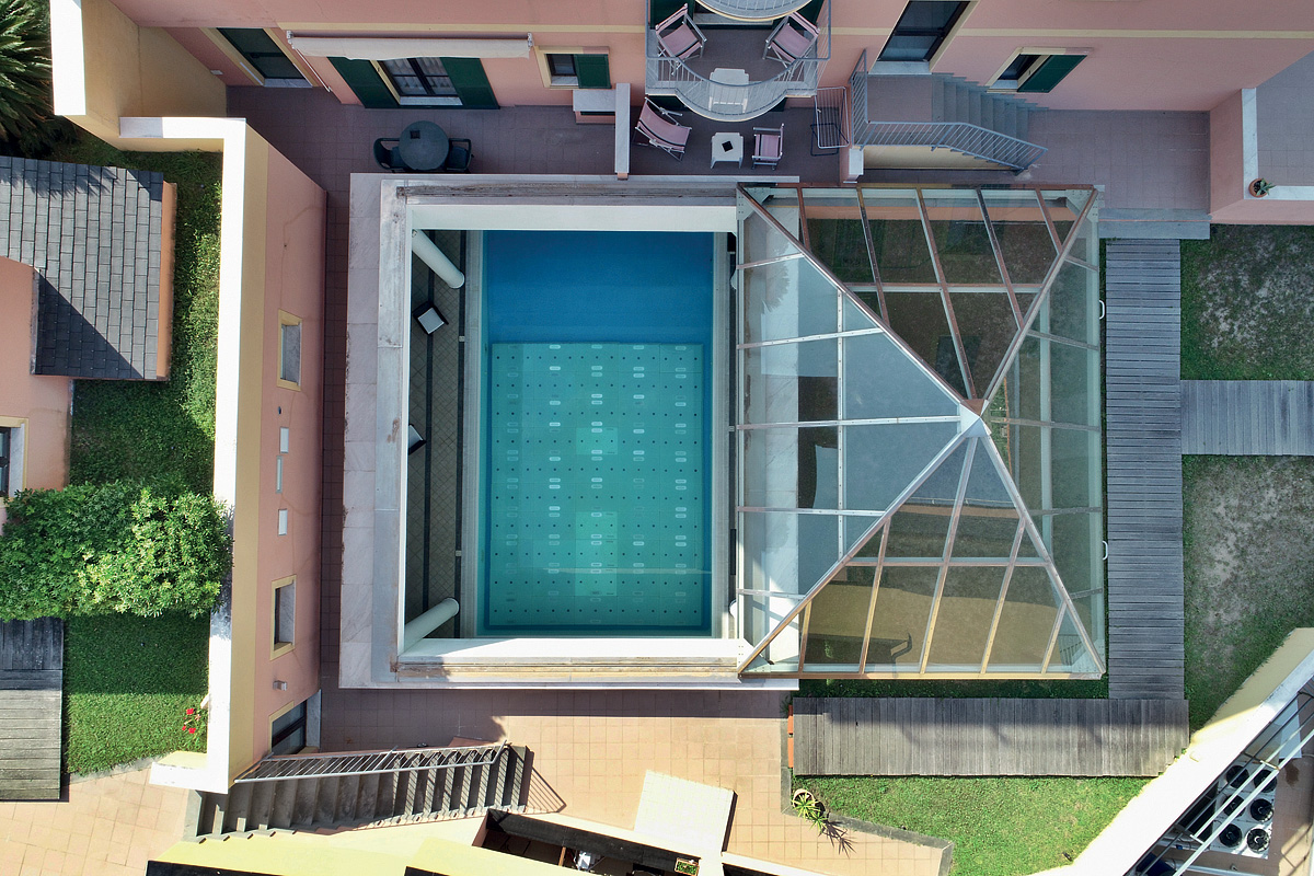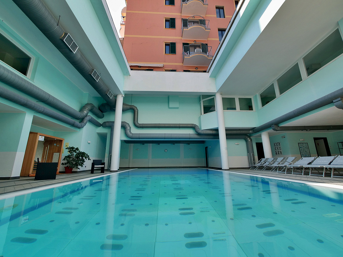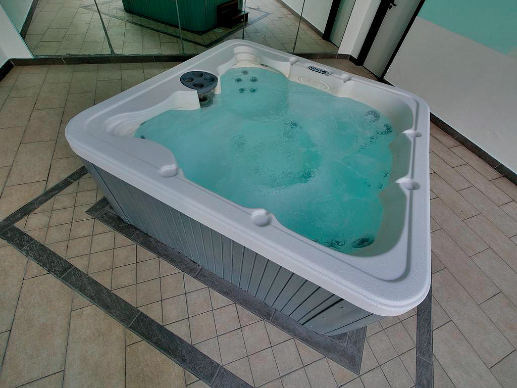 vnitřní bazén cca 15 x 6 m s lehátky a zatahovací střechou, vířivka, malá posilovna