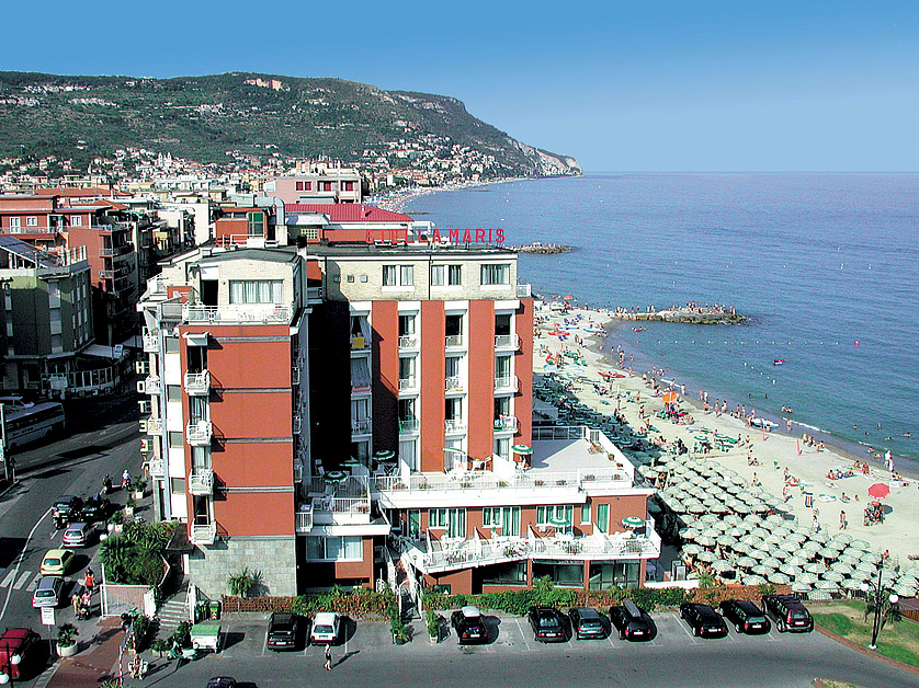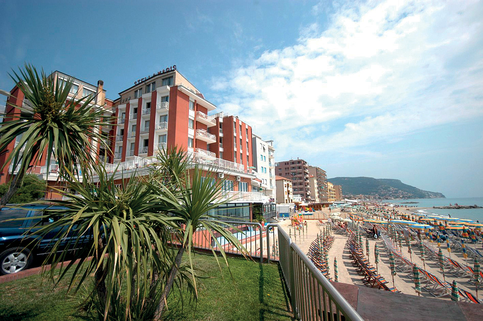 Pietra Ligure, hrubo-písčitá až jemně oblázková pláž s mírně se svažujícím vstupem do moře - 10 m, centrum - 600 m