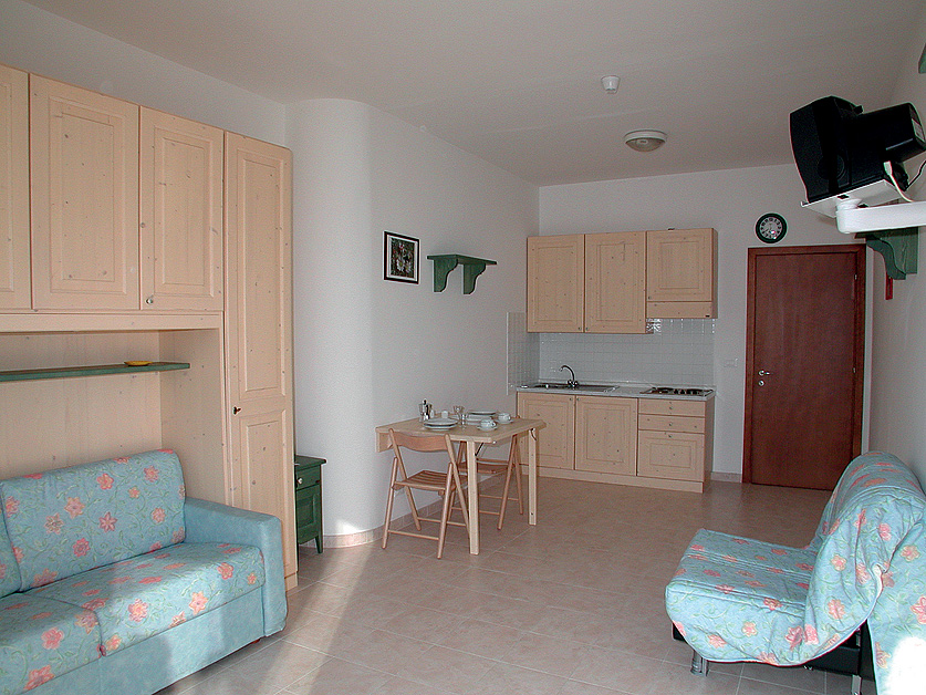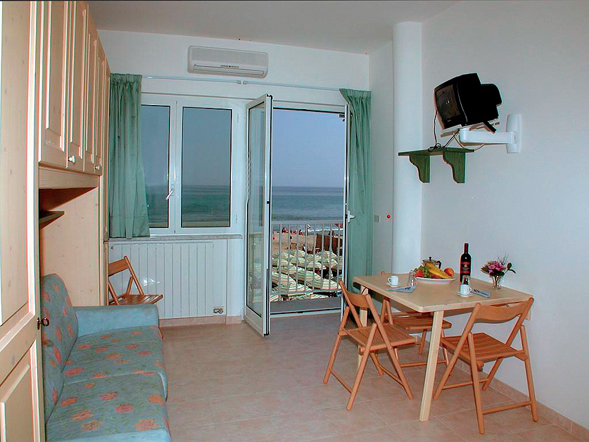 28 m² - obývací pokoj s kuchyňským koutem a rozkládacím gaučem pro 2 osoby a 1 rozkládacím lůžkem či křeslem pro 1 osobu, sociální zařízení se sprchou, balkon nebo francouzské okno s bočním výhledem na moře