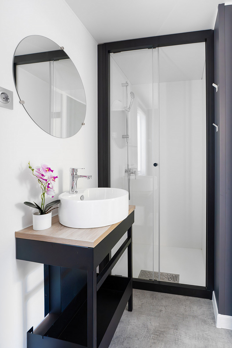 30 m² - ložnice s manželskou postelí, ložnice se 2 samostatnými lůžky a 1 zavěšeným lůžkem (doporučujeme pro děti do 12 let), obytná část s kuchyňským koutem, 2 sociální zařízení se sprchou, krytá terasa