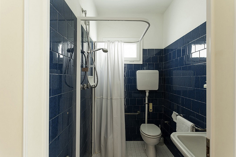 pokoj s jedním lůžkem, sociální zařízení se sprchou se závěsem, malý balkon