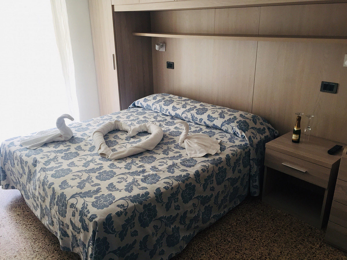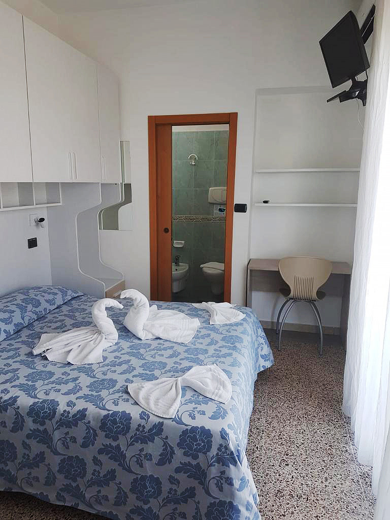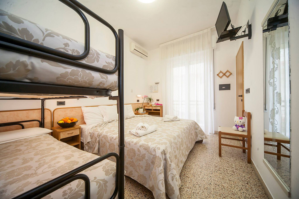 pokoj s manželskou postelí či 2 samostatnými lůžky, sociální zařízení se sprchou, balkon; 3. a 4. lůžko formou pevného lůžka, přistýlky či palandy
