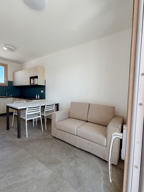 1 ložnice s manželskou postelí, 1 ložnice se 2 samostatnými lůžky, obývací pokoj s kuchyňským koutem a gaučem pro 1 osobu, sociální zařízení se sprchou, terasa