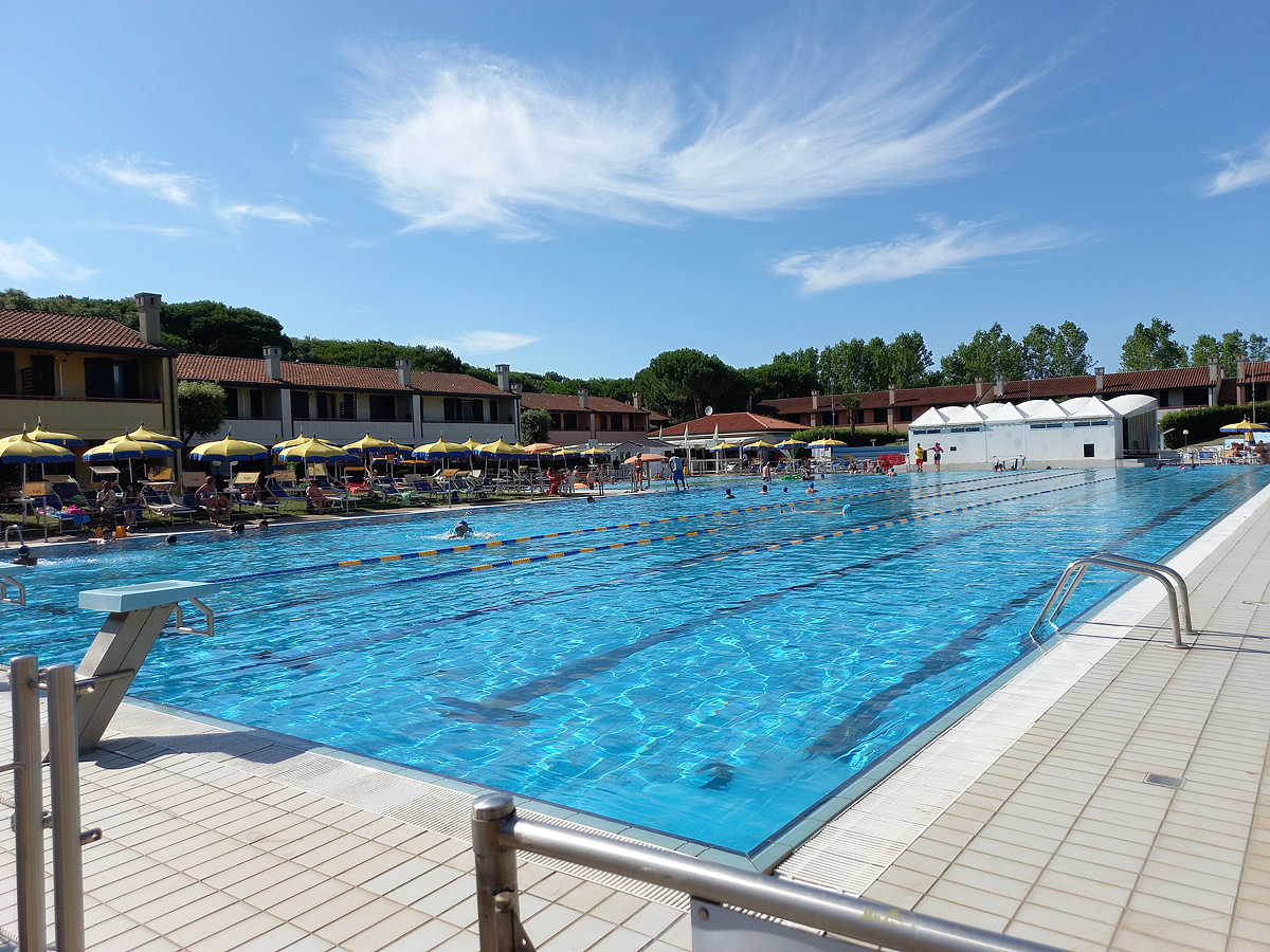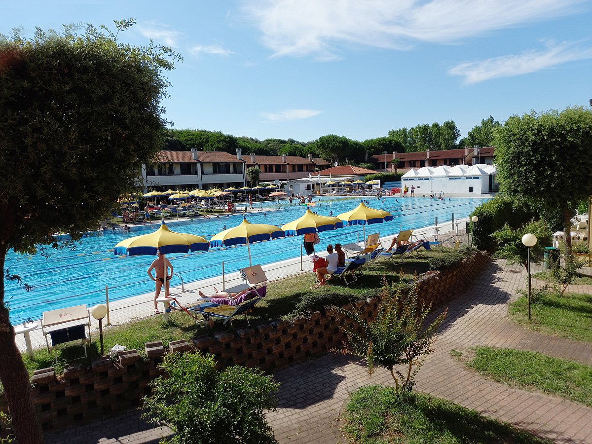 bazén 50 x 25 m se slunečníky a lehátky, dětský bazének, 4x tenisový kurt, mini golf, stolní tenis, fotbalové hřiště, plážový servis* (slunečník, lehátko a plážové křeslo)
