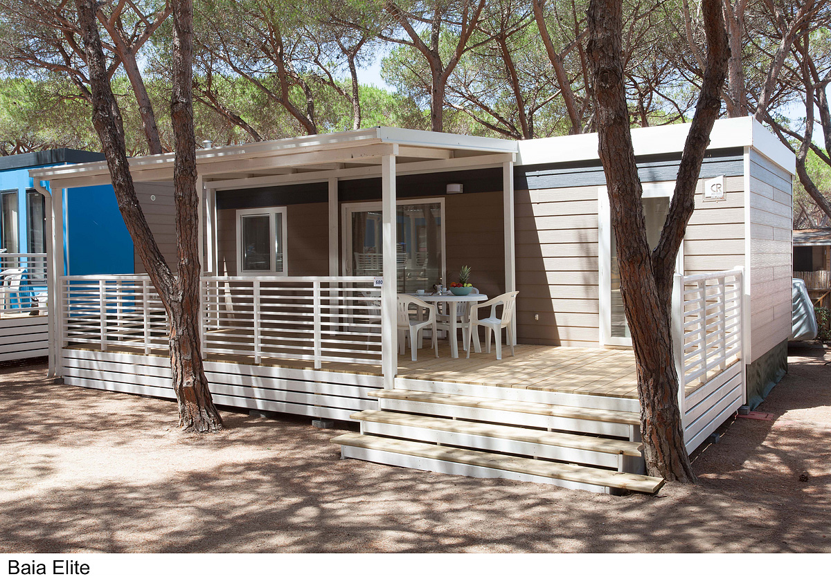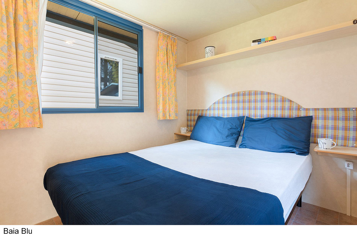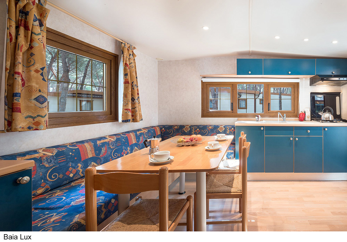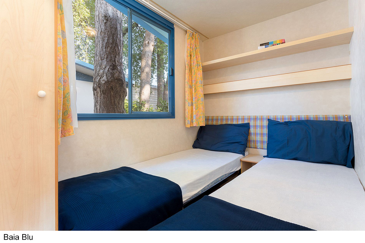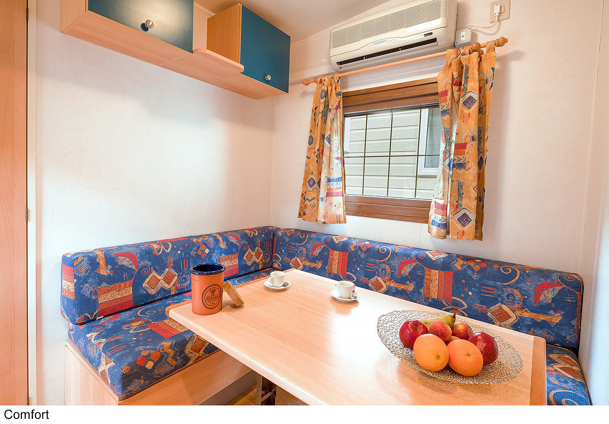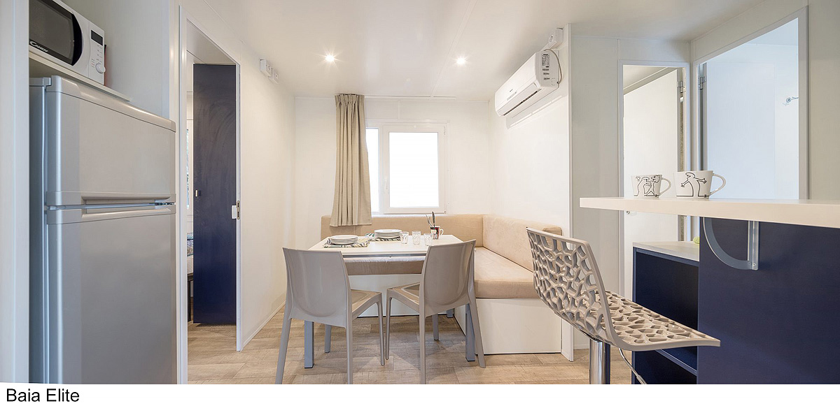 33 m² - ložnice s manželskou postelí, 2 ložnice se 2 samostatnými lůžky, obytná část s kuchyňským koutem, sociální zařízení se sprchou, krytá dřevěná terasa; některé mobilhomy mají navíc ještě samostatné WC; vzdálenost od pláže cca 150-200 m
