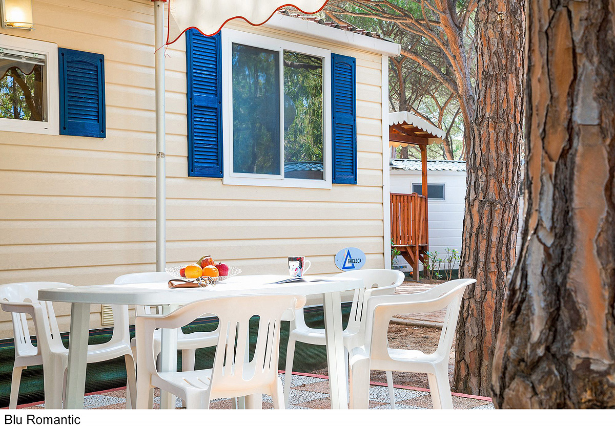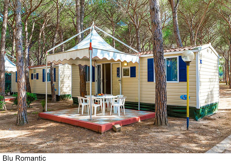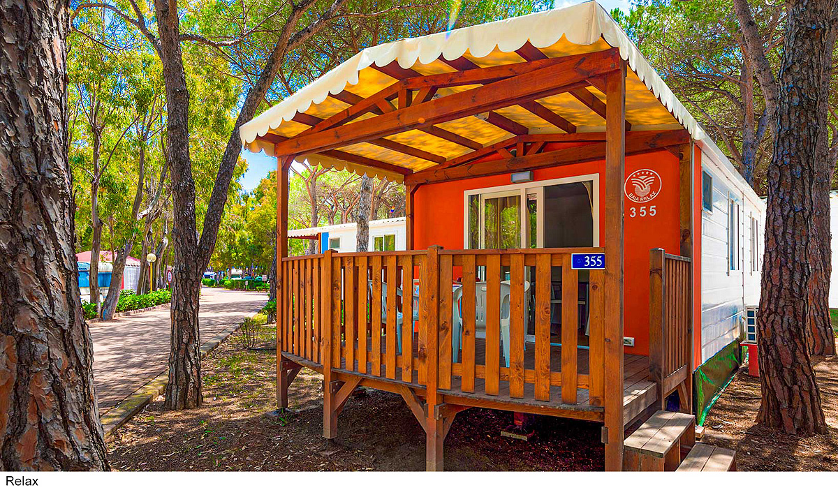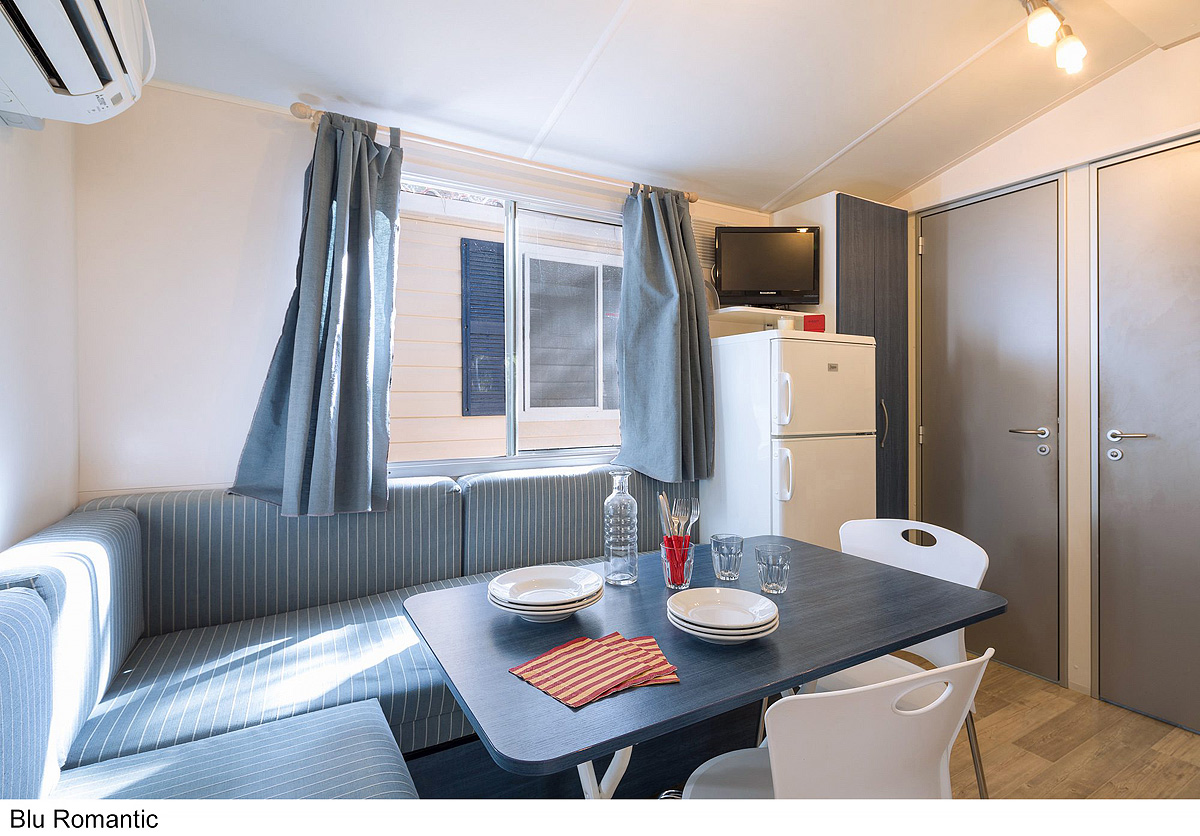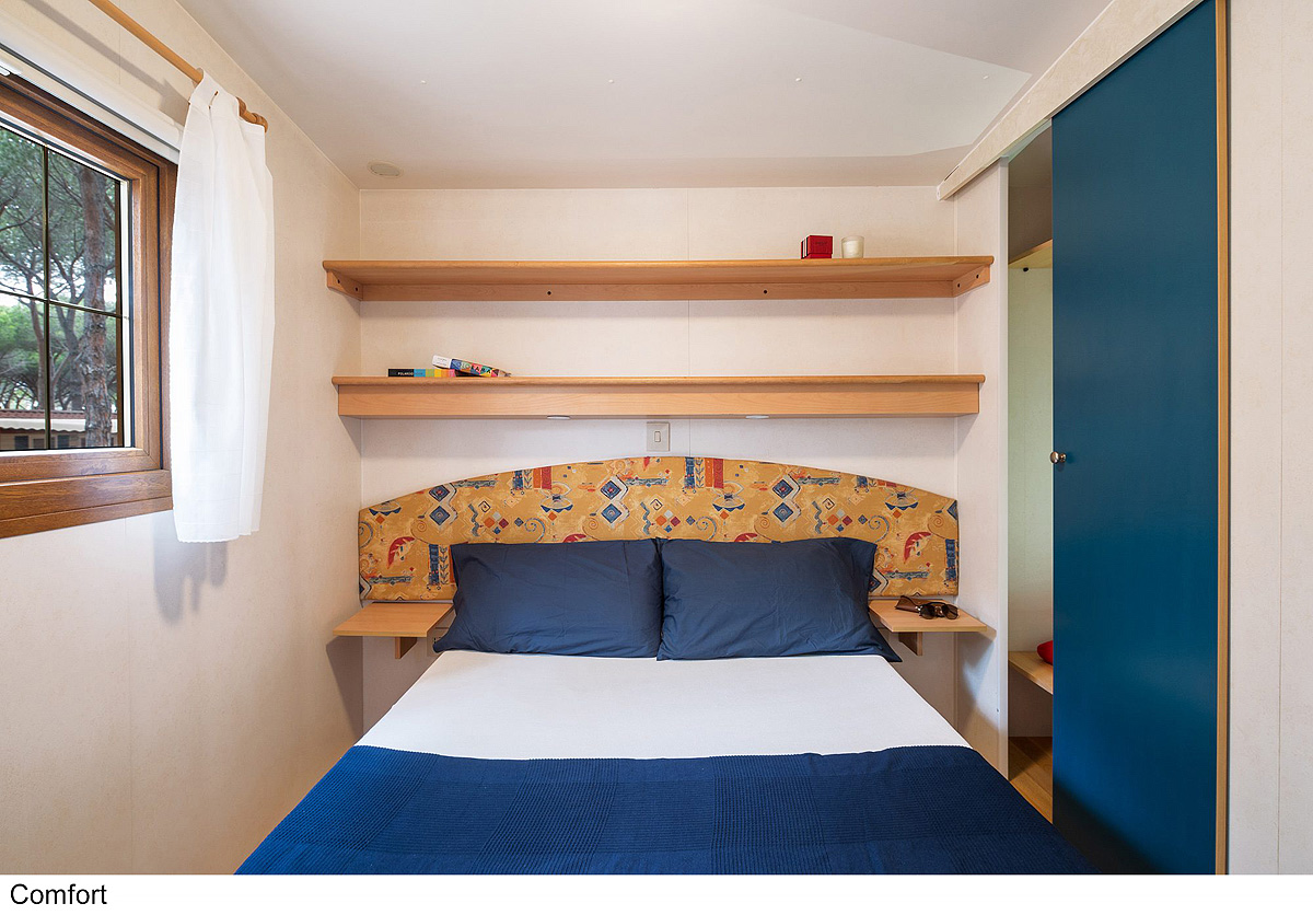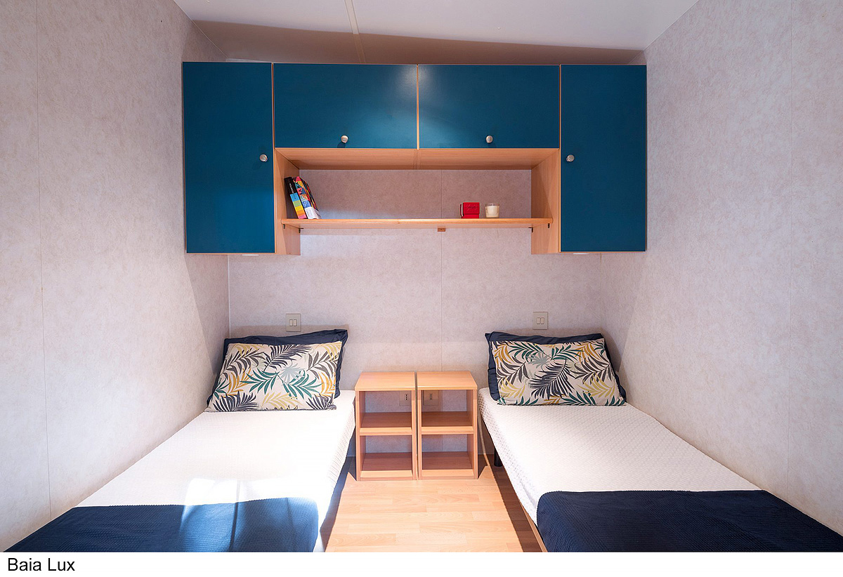33 m² - ložnice s manželskou postelí, 2 ložnice se 2 samostatnými lůžky, obytná část s kuchyňským koutem, sociální zařízení se sprchou, krytá dřevěná terasa; některé mobilhomy mají navíc ještě samostatné WC; vzdálenost od pláže cca 150-200 m