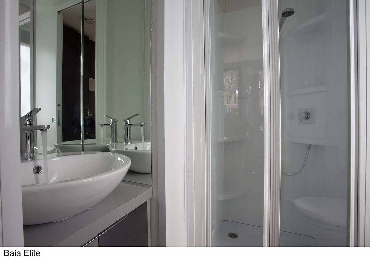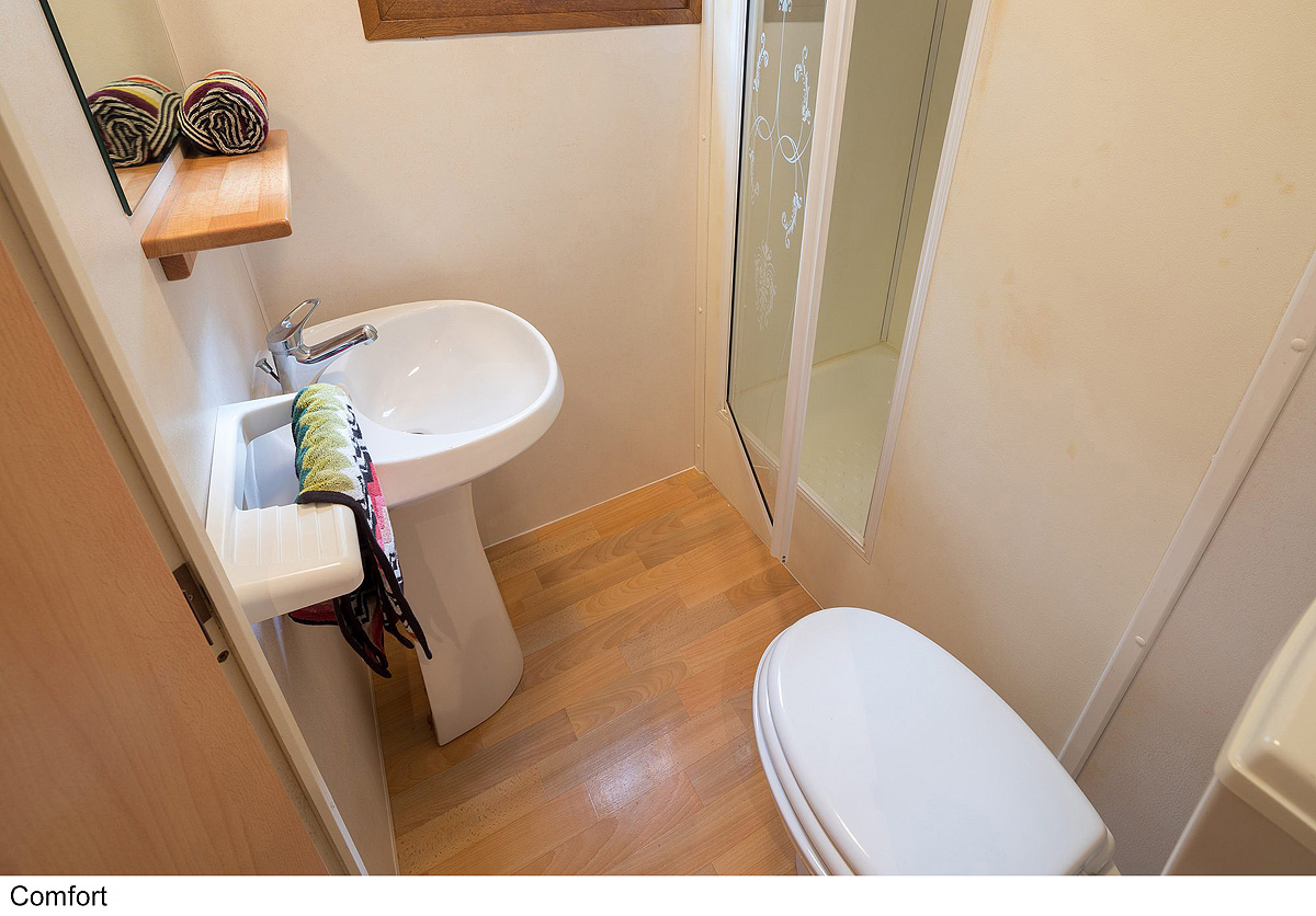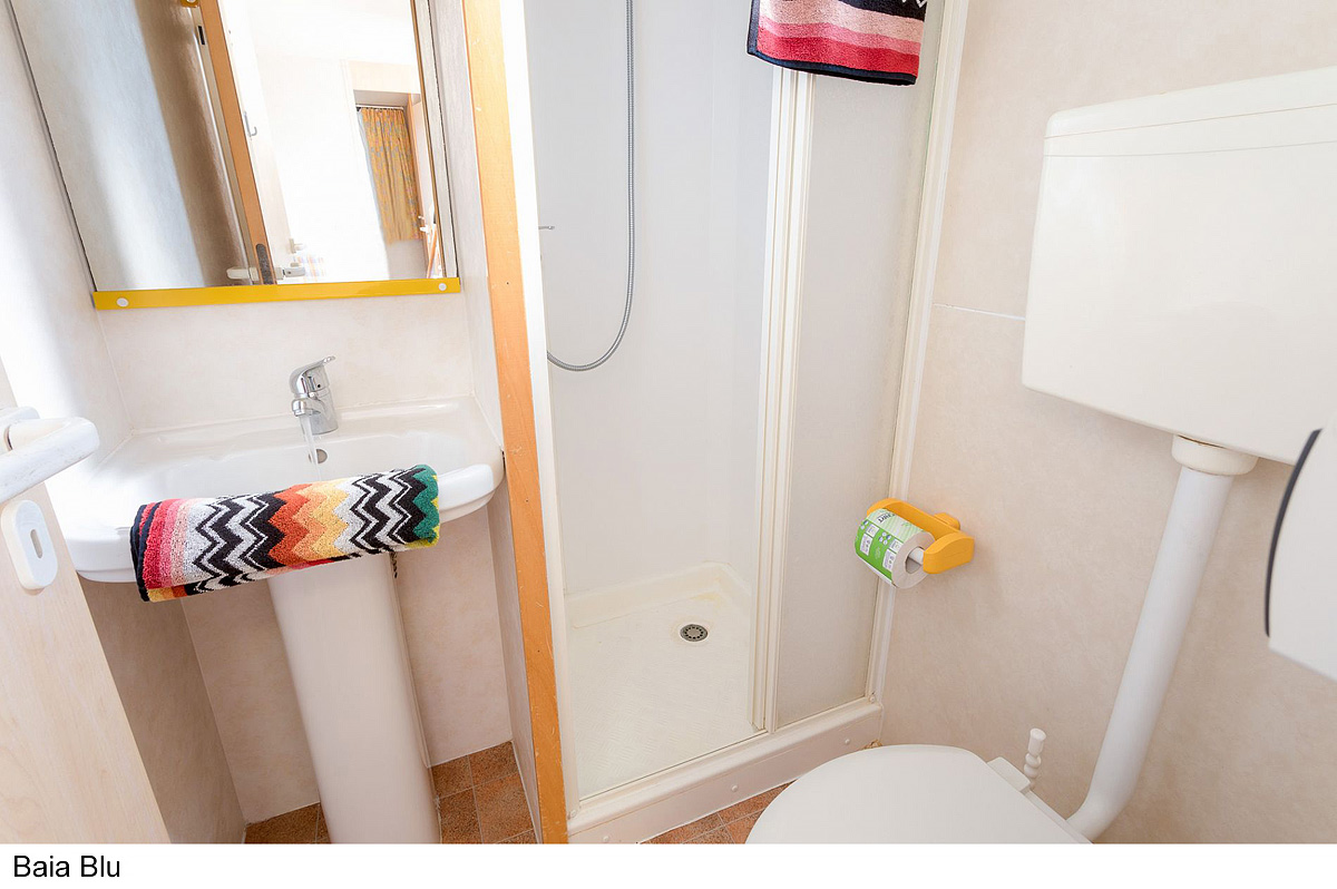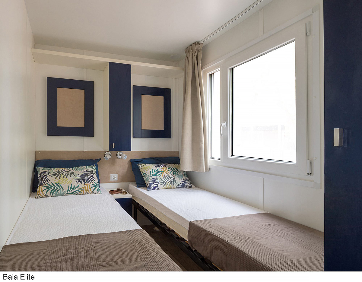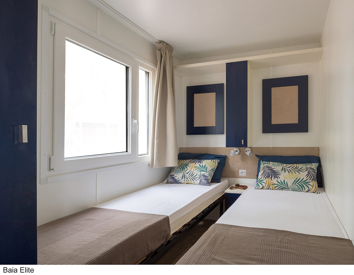 33 m² - ložnice s manželskou postelí, 2 ložnice se 2 samostatnými lůžky, obytná část s kuchyňským koutem, sociální zařízení se sprchou, krytá dřevěná terasa; některé mobilhomy mají navíc ještě samostatné WC; vzdálenost od pláže cca 150-200 m