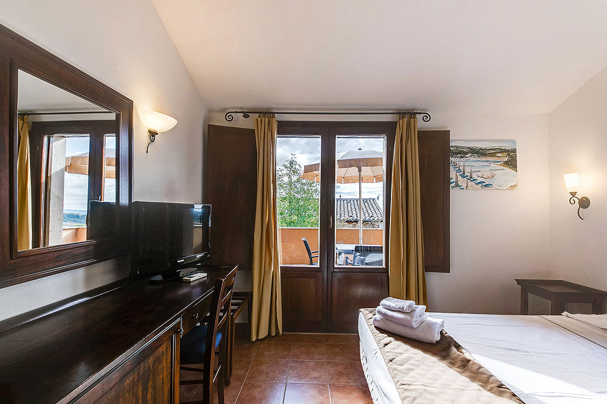 pokoj s manželskou postelí či 2 samostatnými lůžky, sociální zařízení se sprchou, balkon či veranda