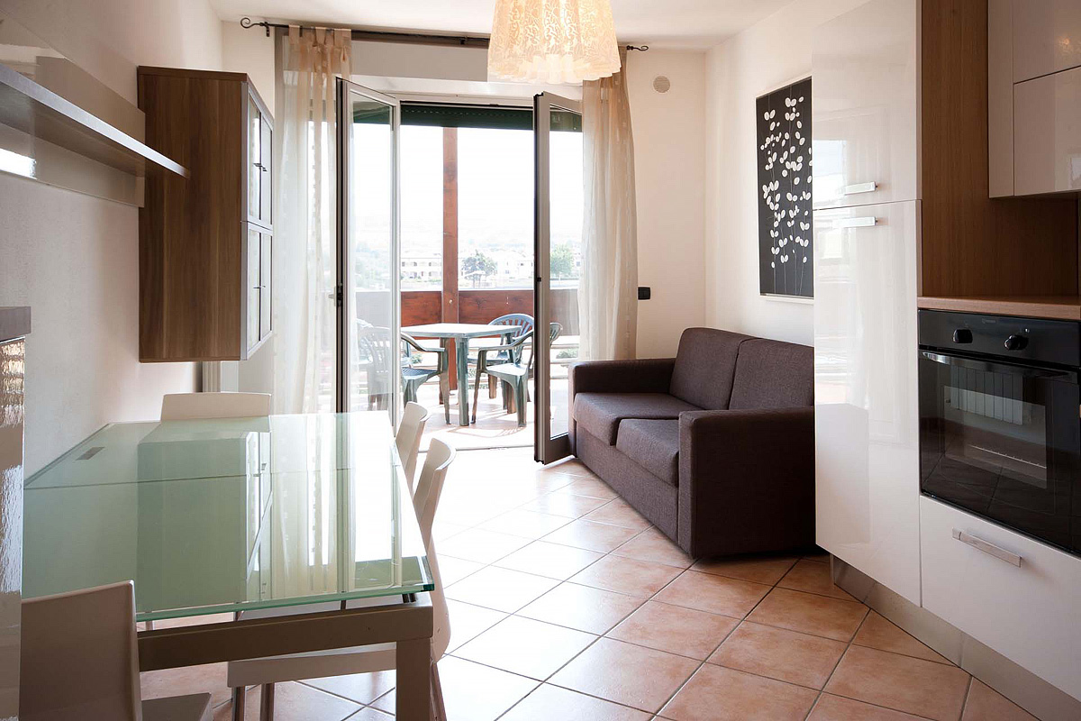 ložnice s manželskou postelí nebo 2 oddělenými lůžky, obývací pokoj s kuchyňským koutem a rozkládacím gaučem pro 2 osoby, sociální zařízení se sprchou, terasa či balkon