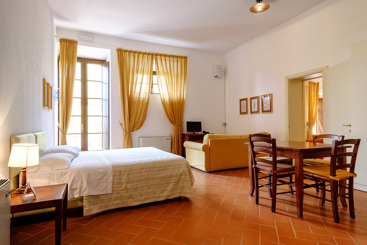 35 m² - obývací pokoj s manželskou postelí a kuchyňským koutem, sociální zařízení se sprchou