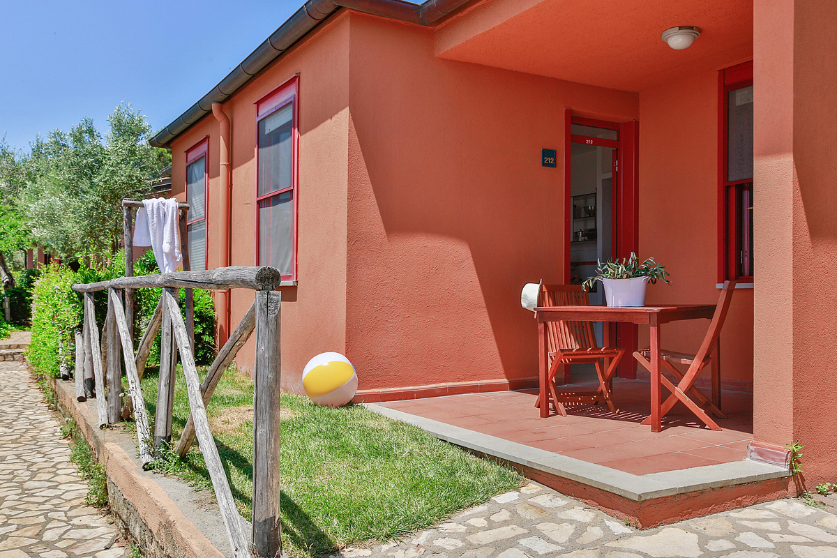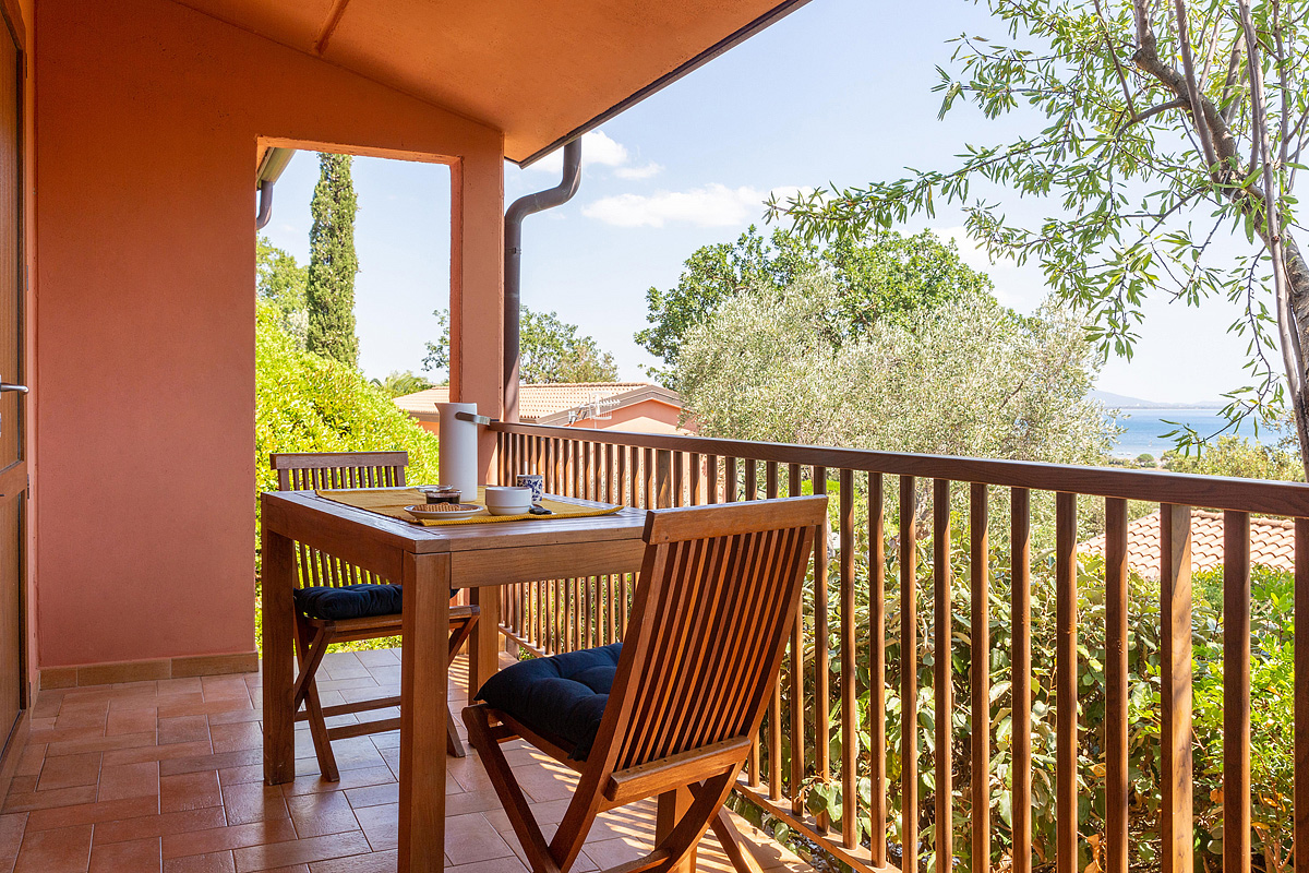 40 m² - ložnice s manželskou postelí, obývací pokoj s kuchyňským koutem a 2 samostatnými lůžky, sociální zařízení se sprchou, terasa, výhled na záliv Talamone