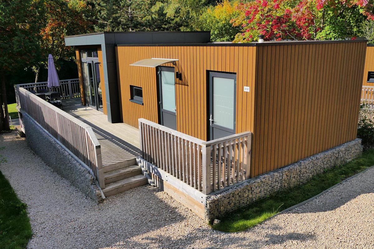 moderní bungalov, 1 ložnice s manželskou postelí, 1 ložnice se 2 samostatnými lůžky, obývací prostor s kuchyňským koutem, sociální zařízení se sprchou, venkovní terasa / veranda se zahradním nábytkem, max. obsazení 4 osoby, 1 parkovací místo u bungalovu