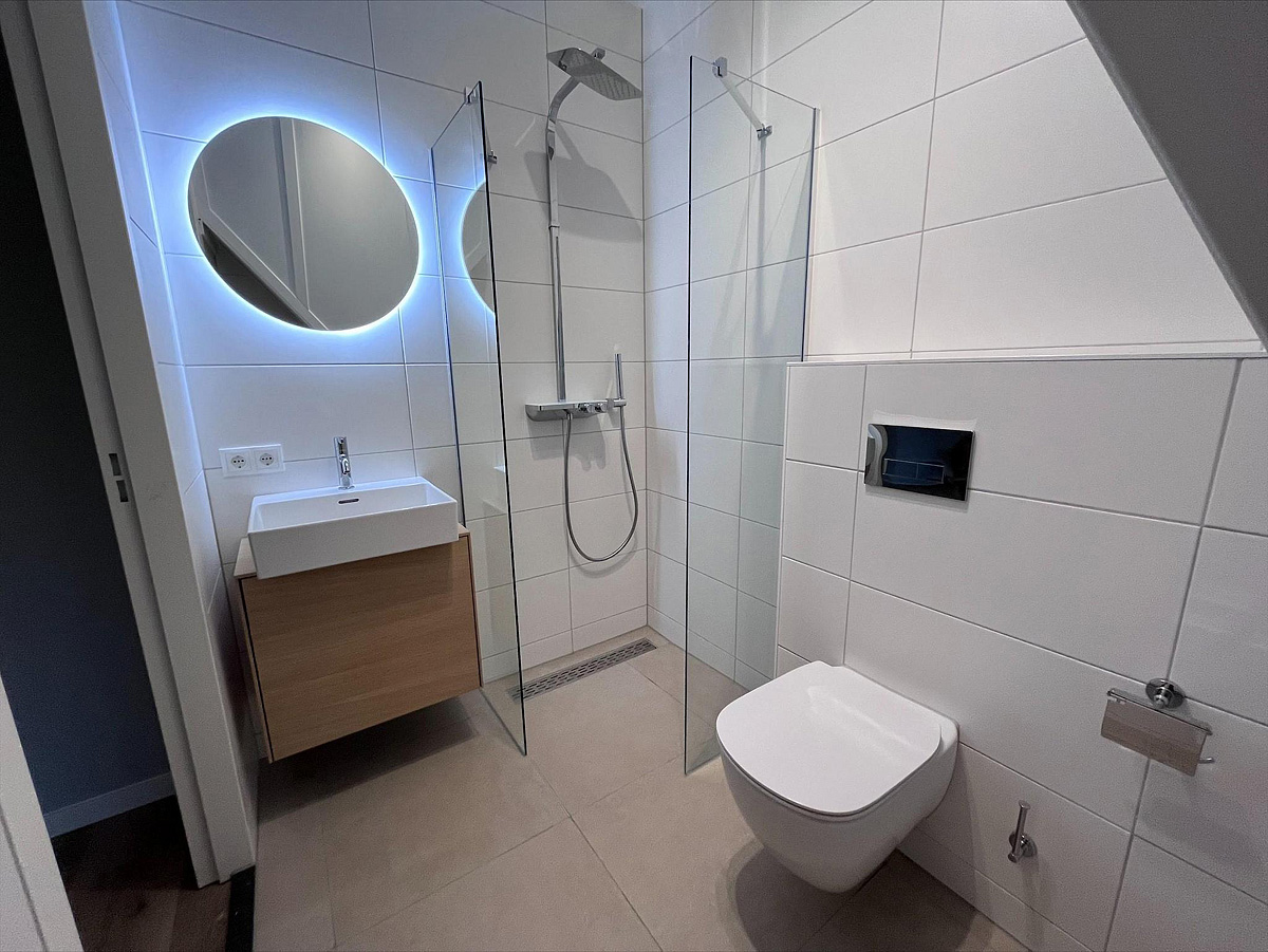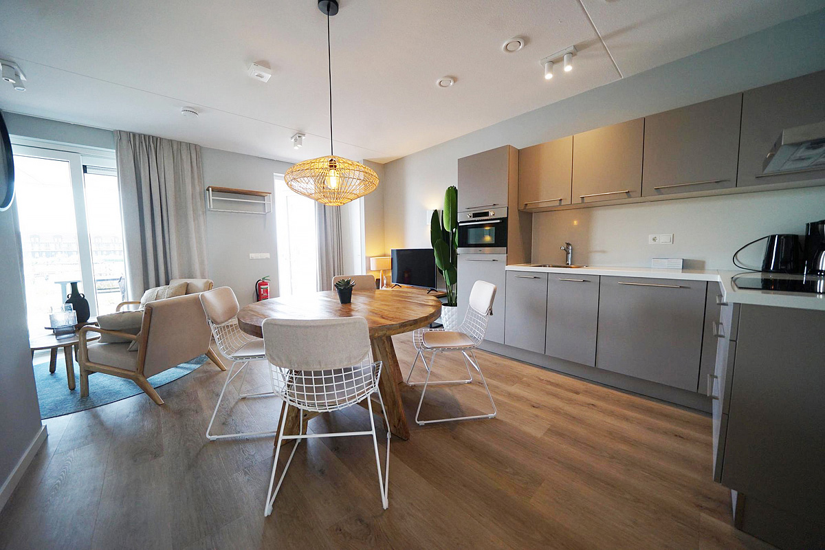 85 m² - prostorný dvoupatrový apartmán, přízemí: obývací pokoj s kuchyňským koutem, terasa, 1. patro: 3 ložnice se 2 samostatnými lůžky typu boxpring, 2 sociální zařízení se sprchou, podlahové vytápění v přízemí, balkon s výhledy na přístav, max. obsazení 6 osob, 2 parkovací místa