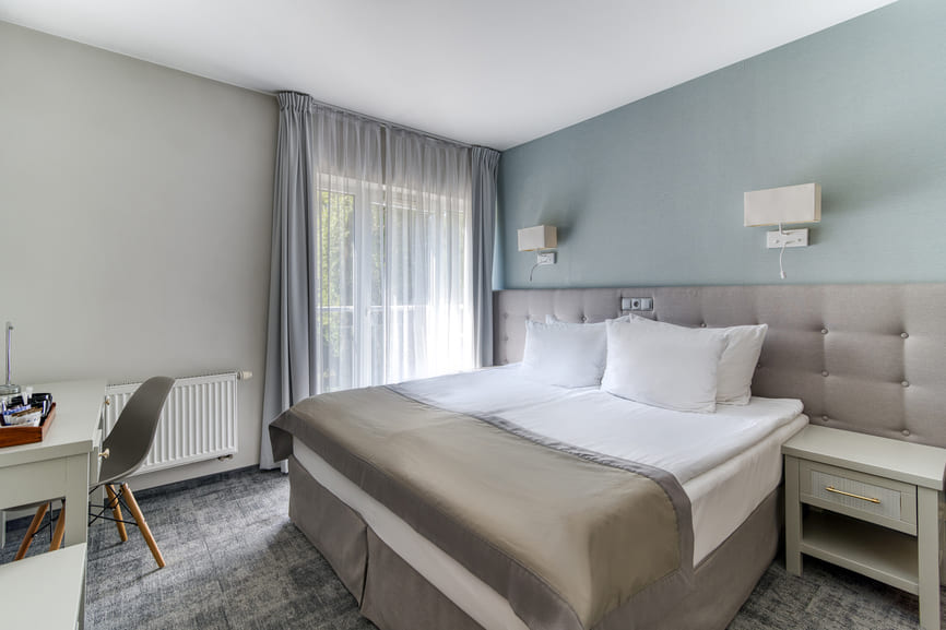 18 m² – pokoj s manželskou postelí či 2 oddělitelnými lůžky, s možností 1 přistýlky, sociální zařízení