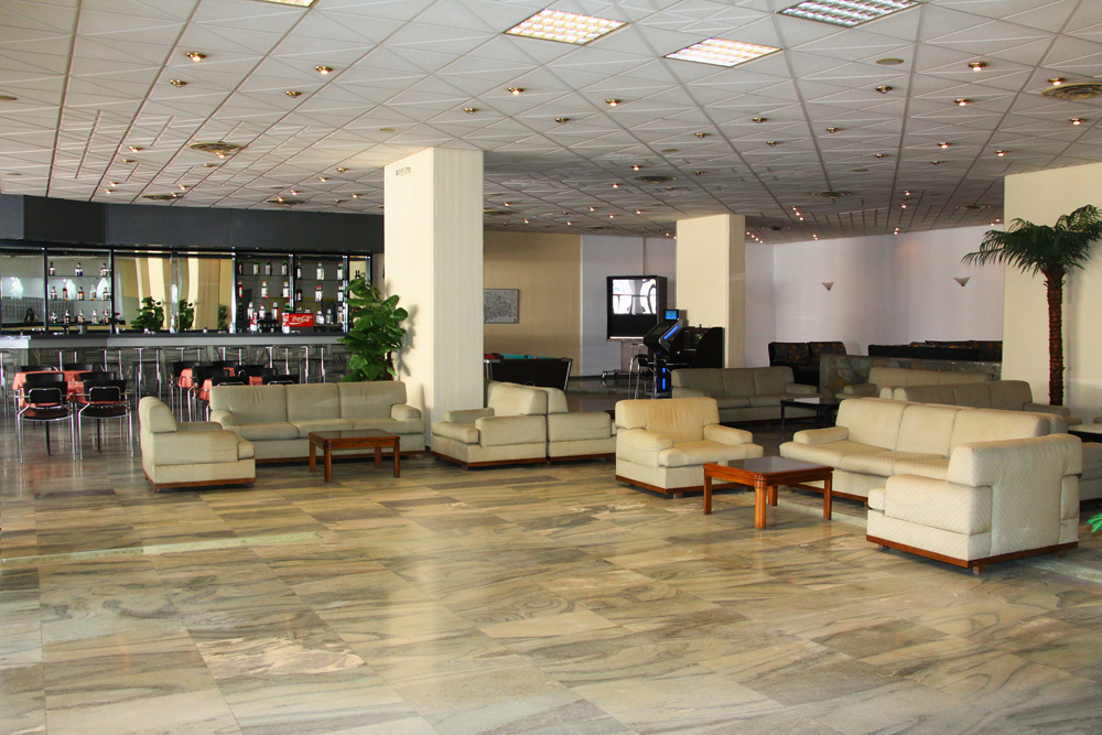 Vstupní hala s recepcí, lobby, restaurace, bar, bar u bazénu. V zahradě bazén s lehátky a slunečníky a terasou na opalování.