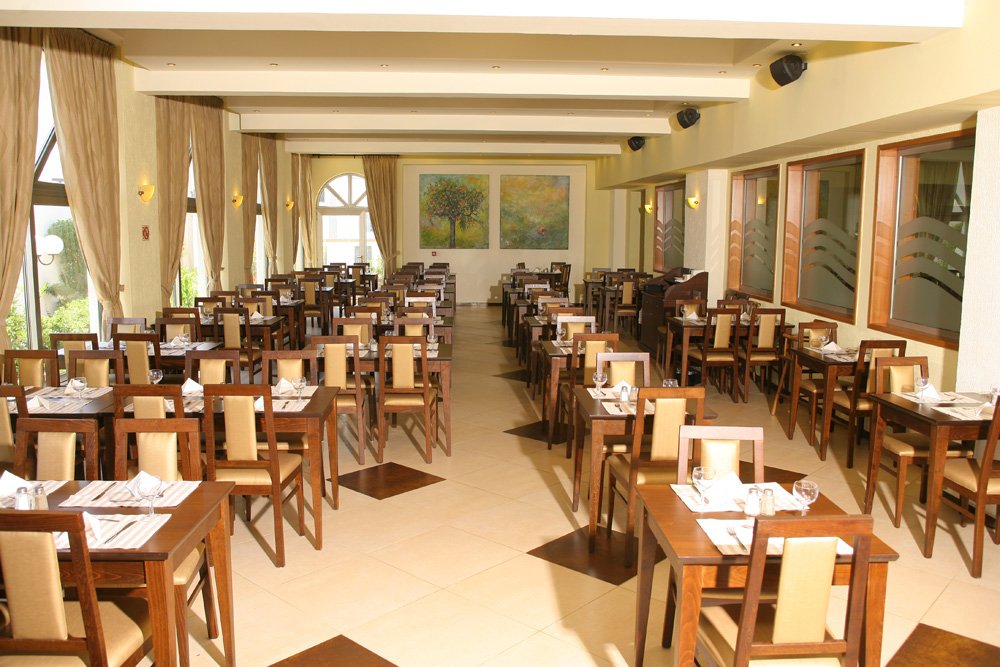 Hlavní budova a několik vedlejších budov v zahradě, vstupní hala s recepcí, restaurace, bary, konferenční místnost. Venku 2 bazény (1 s mořskou vodou), bazén pro děti, terasa na slunění s lehátky a slunečníky zdaŕma.
