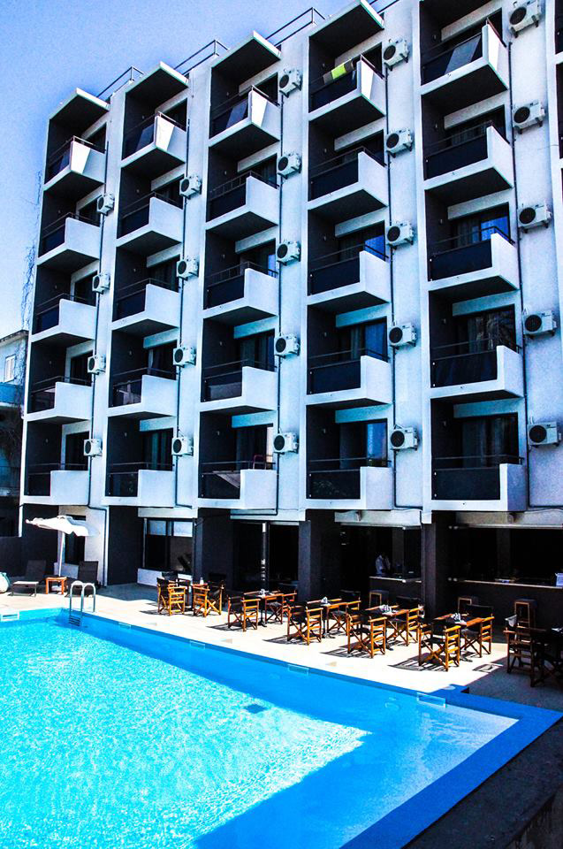 Vstupní hala s recepcí, výtah, bazén, restaurace, sluneční terasa, pronájem aut, bar