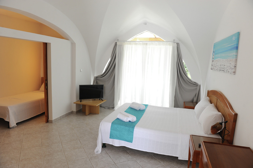 DR: koupelna/WC (vysoušeč vlasů), klimatizace, telefon, TV/sat., lednička, trezor, balkon nebo terasa. FR: viz.DR, dvě místnosti oddělené zatahovacími dveřmi.