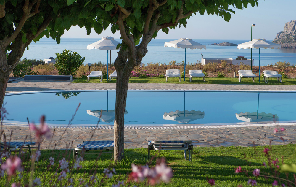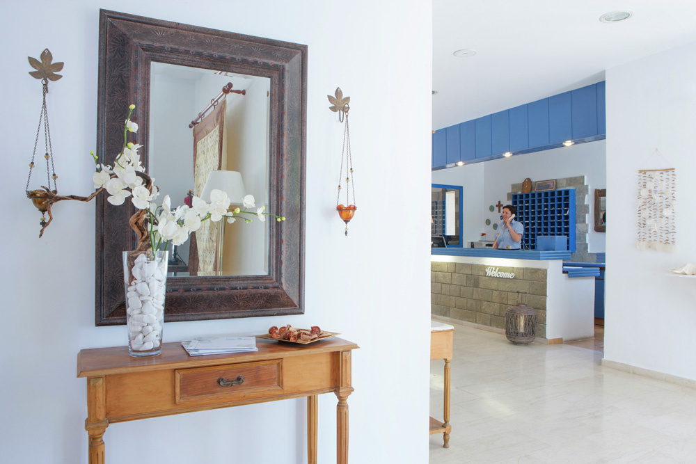 V typickém řeckém stylu, vstupní hala s recepcí, restaurace, bary, Venku: 1 bazén, bar u bazénu, lehátka a slunečníky u bazénů zdarma.