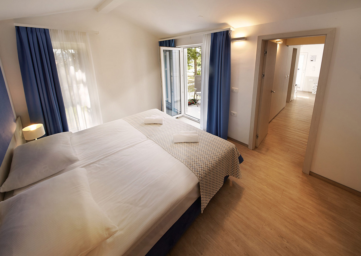 Standard 2+2 B - oddělená ložnice s manželskou postelí či 2 oddělenými lůžky, přistýlka v předsíni pro 2 děti do nedovršených 18 let, sociální zařízení se sprchou, balkon nebo terasa