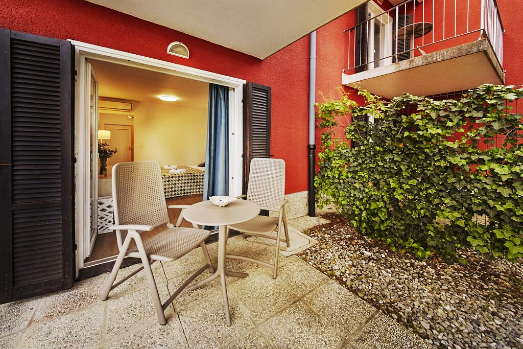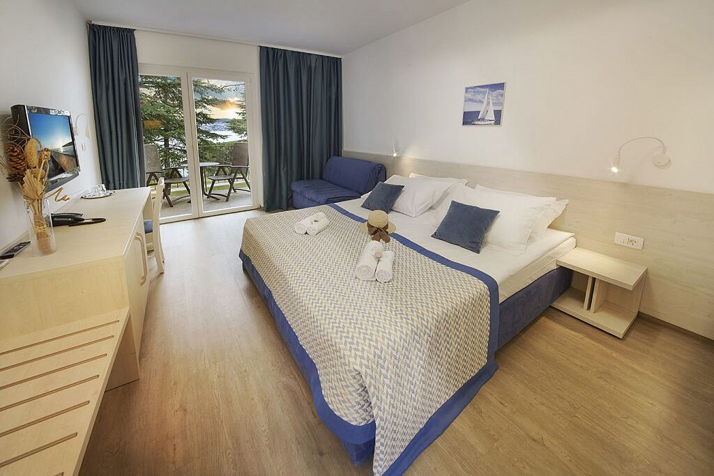 Standard 2+2 B - pokoj s manželskou postelí či 2 oddělenými lůžky, přistýlka pro 2 děti do nedovršených 10 let, sociální zařízení se sprchou, balkon nebo terasa