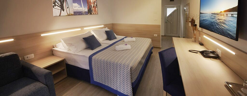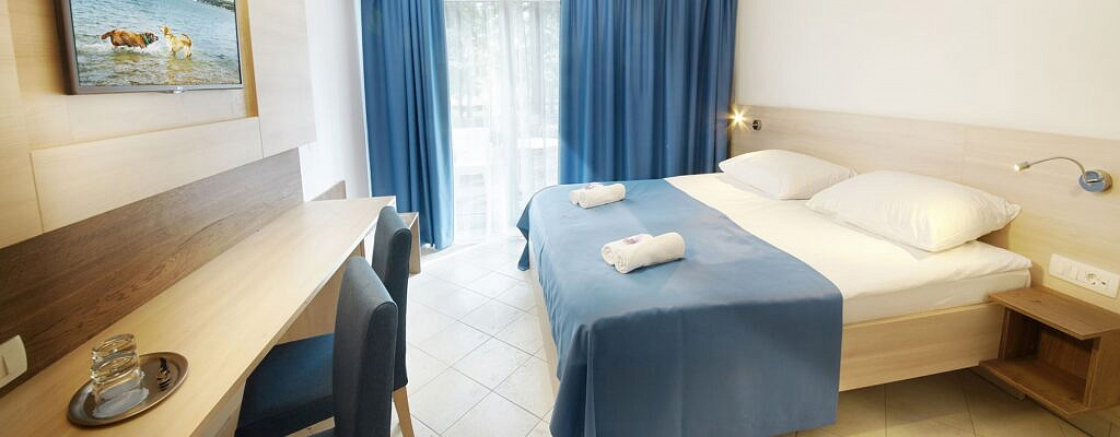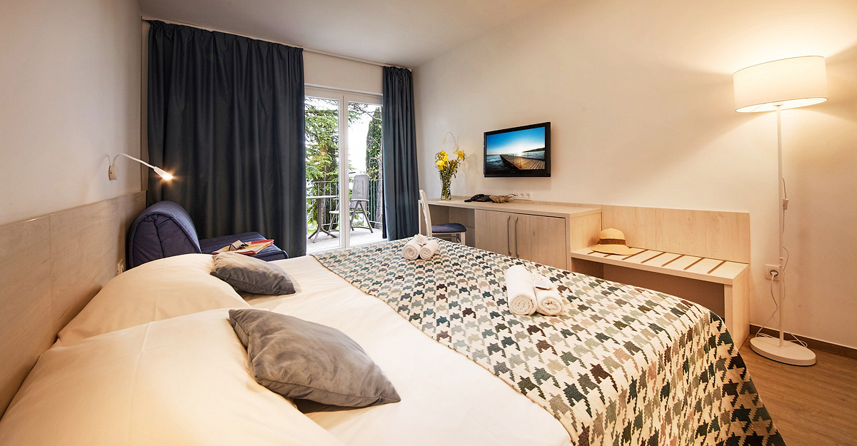 Standard 1+2 B - pokoj s manželskou postelí či 2 oddělenými lůžky, přistýlka pro 2 děti do nedovršených 10 let, sociální zařízení se sprchou, balkon nebo terasa