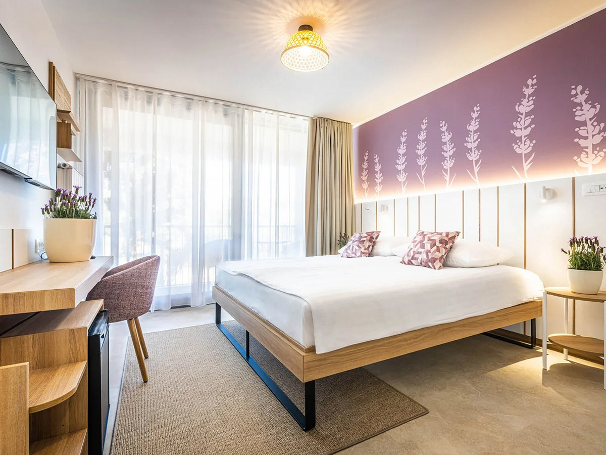 klimatizace, TV, telefon, wi-fi připojení k internetu, fén, minibar, některé s balkónem nebo terasou, případně francouzským oknem