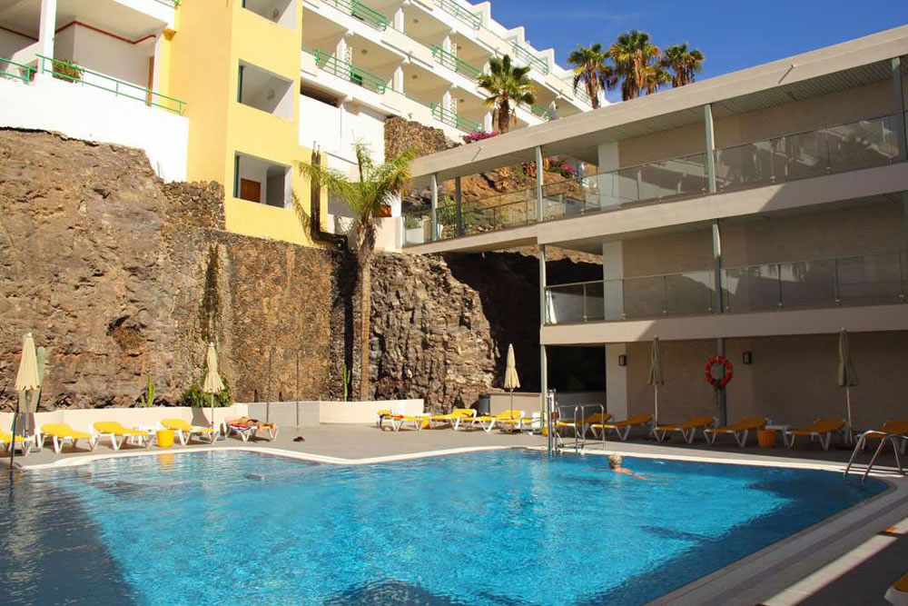 Hotel ve svahu a skále s výhledy na pláž Jandía. 3 budovy, vstupní hala s recepcí, 2 výtahy, restaurace, bar. Ve vnitrobloku bazén (ve 4. patře), jacuzzi, v nejvyšším patře terasa na slunění s lehátky a slunečníky zdarma; osušky nejsou k dispozici.