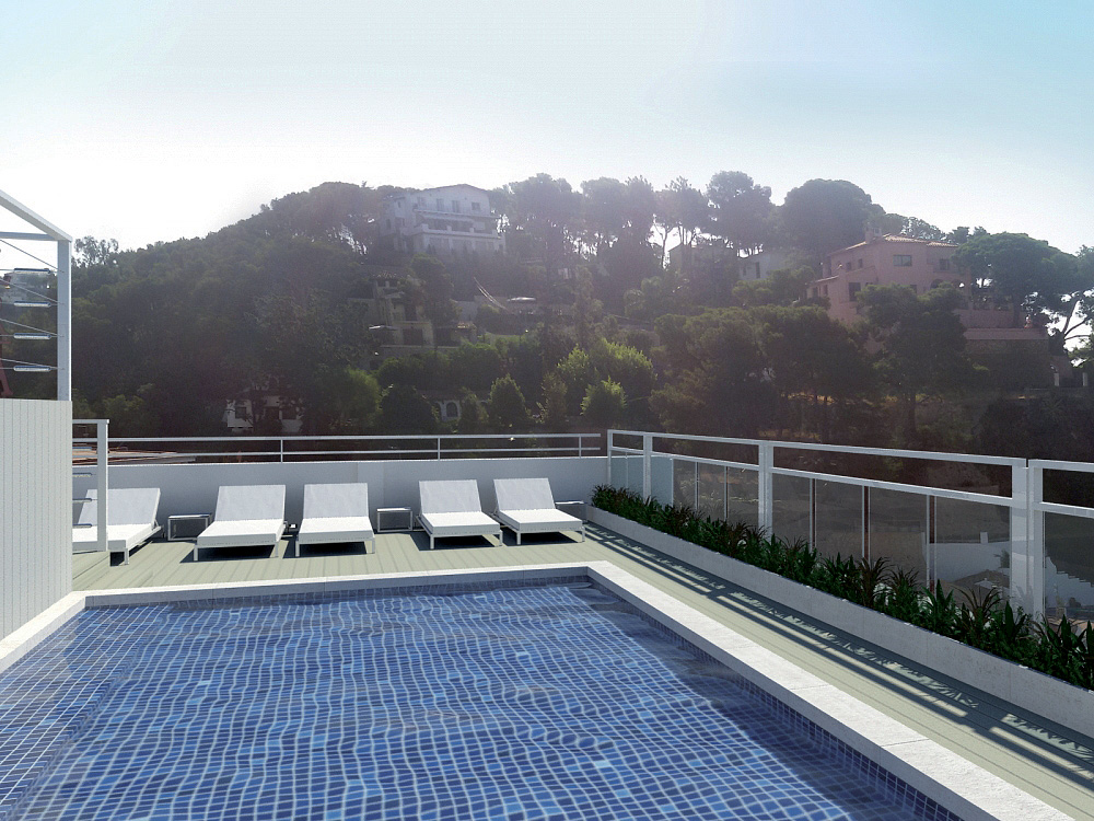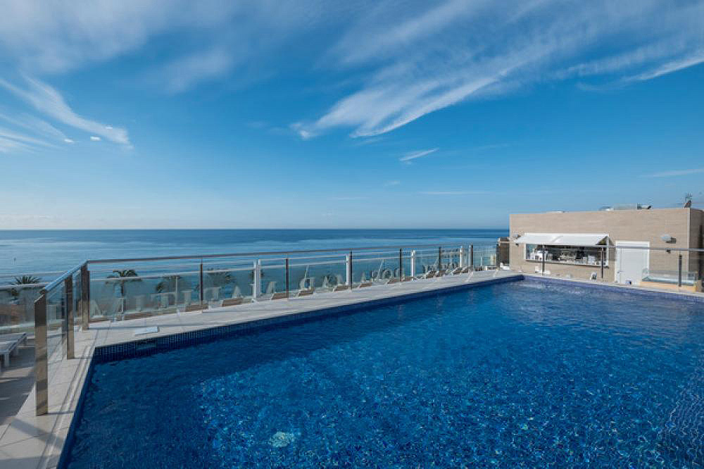 menší bazén situovaný na terase hotelu, jacuzzi s výhledem na moře, posilovna,