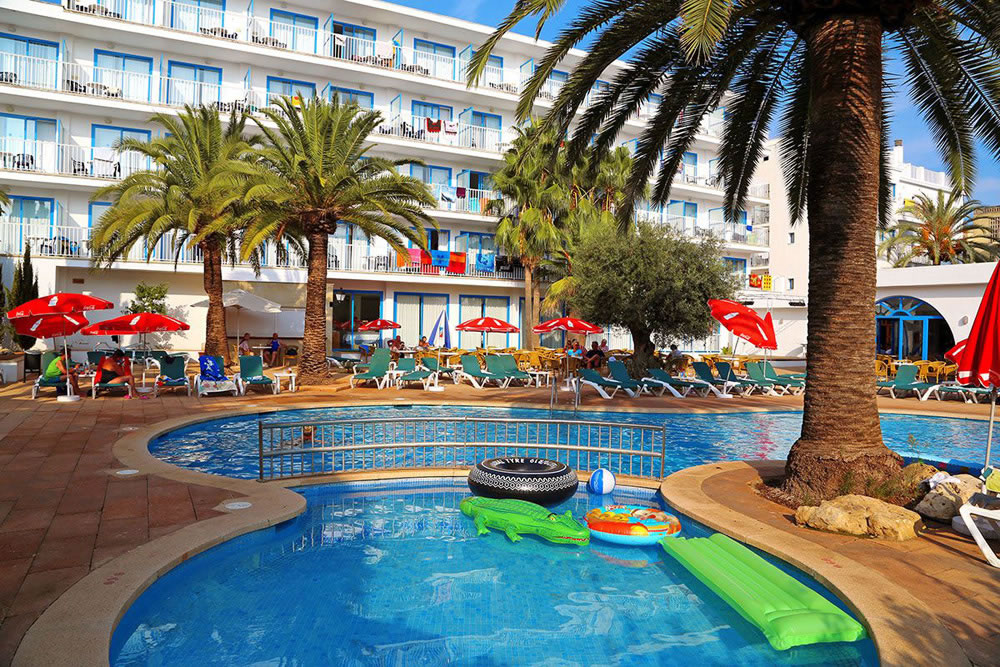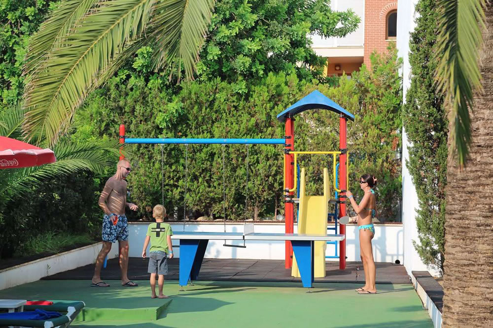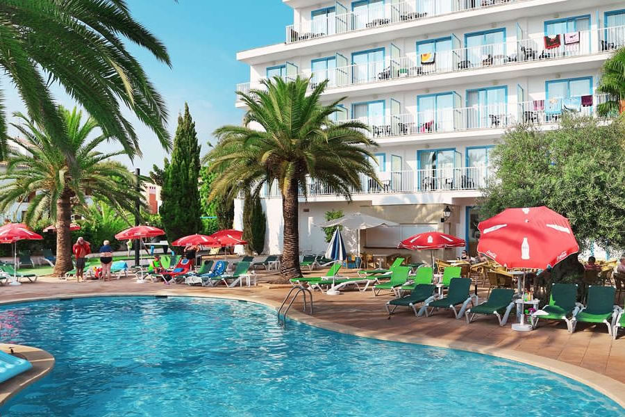2 budovy, 108 pokojů, 4 patra, vstupní hala s recepcí, výtah, restaurace, bar, společenská místnost s TV/sat. Venku bazén, bar u bazénu, terasa s lehátky a slunečníky zdarma.