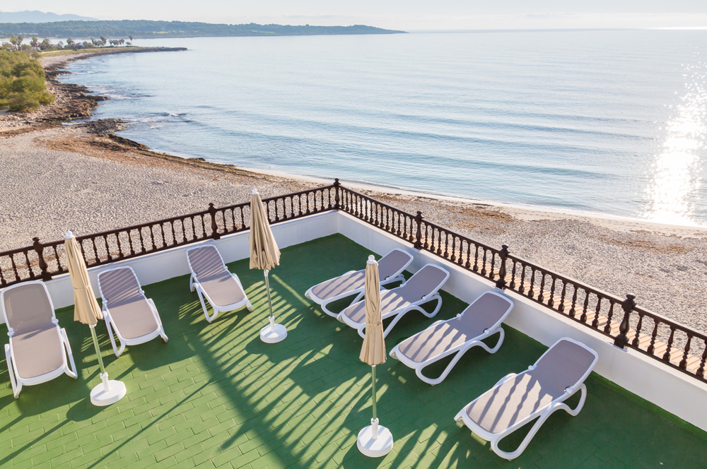Šikorá písečná pláž s pozvolným vstupem do moře oddělena pouze pěší promenádou, lehátka a slunečníky za poplatek.