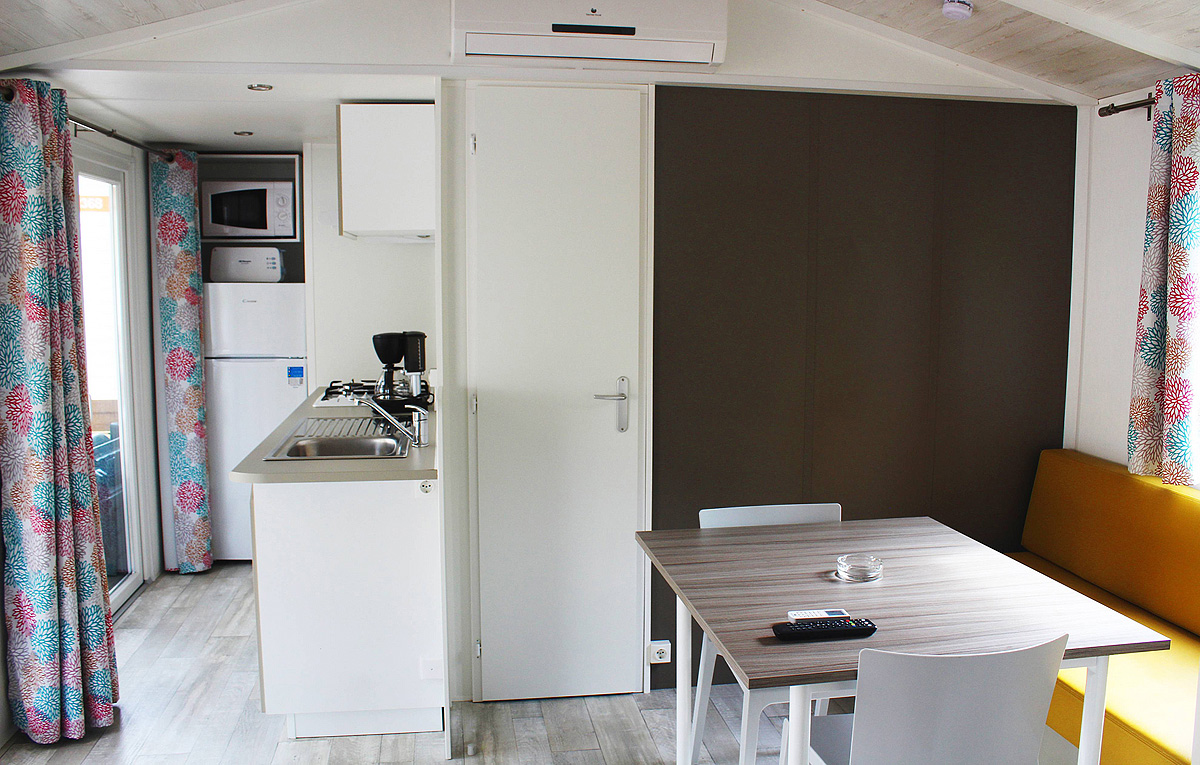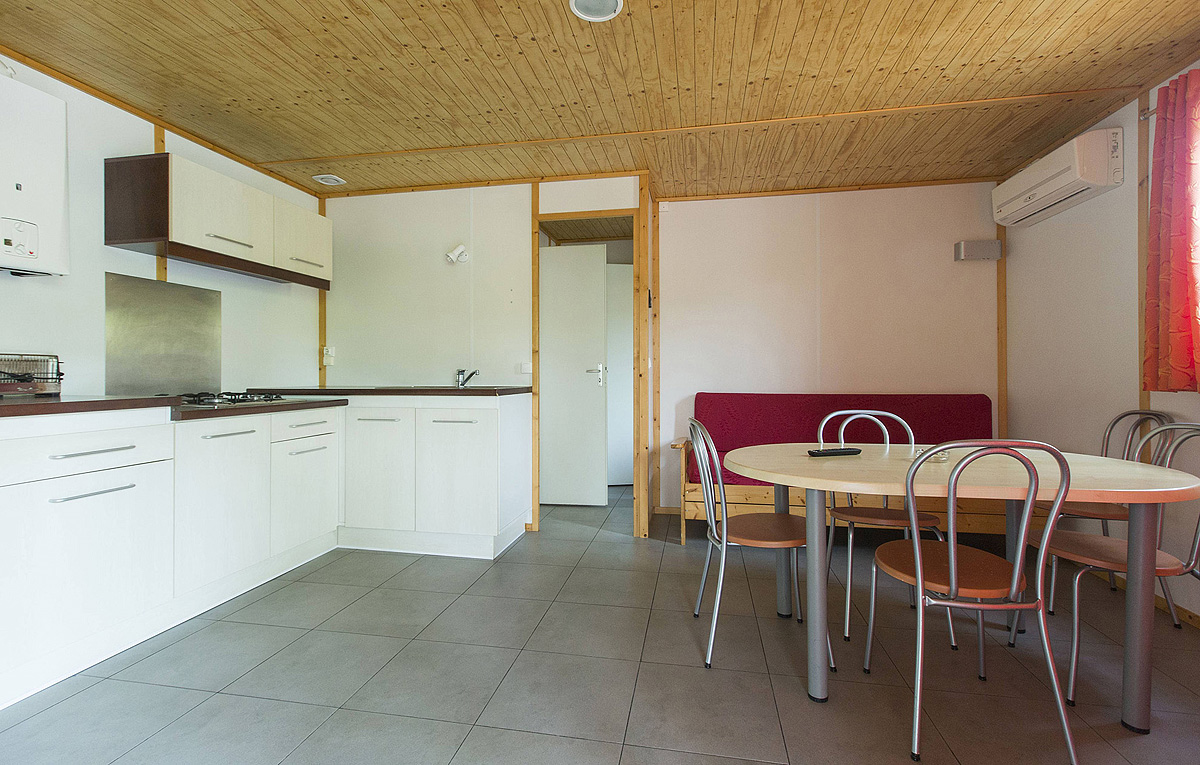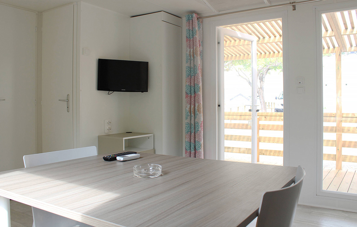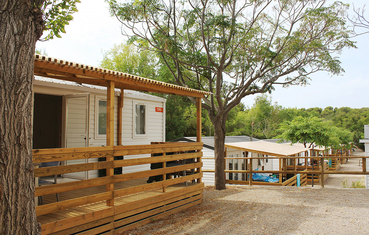 Mobile Home 4+2 - 49 m² - 1 ložnice s manželskou postelí, 1 ložnice se 2 samostatnými lůžky, 1 ložnice s palandou, obytná část s kuchyňským koutem, sociální zařízení se sprchou, částečně krytá dřevěná terasa