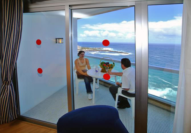 DR: koupelna/WC (vysoušeč vlasů), TV/sat., klimatizace, trezor za poplatek, minibar, telefon a balkon. DRS: viz DR, výhled na moře.