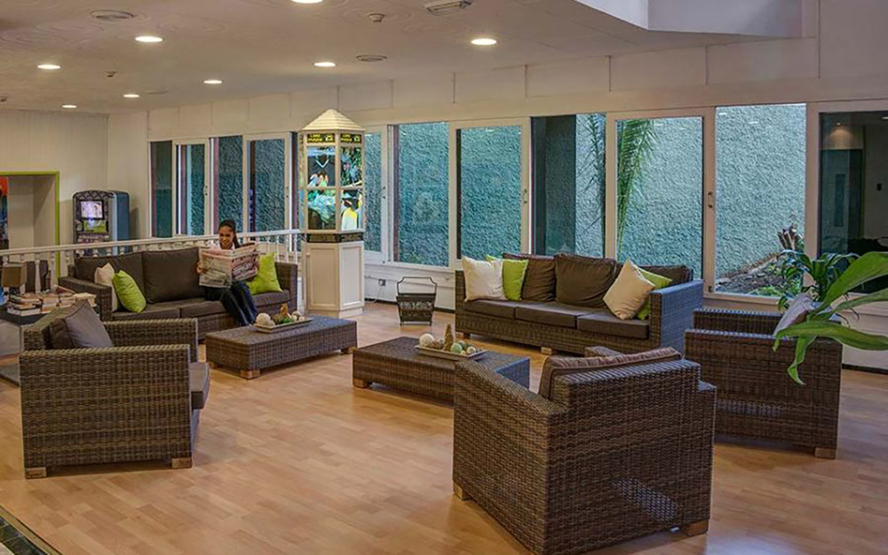 Vstupní hala s recepcí, výtahy, hlavní restaurace, bar, bazén s terasou na slunění, lehátky a slunečníky zdarma.