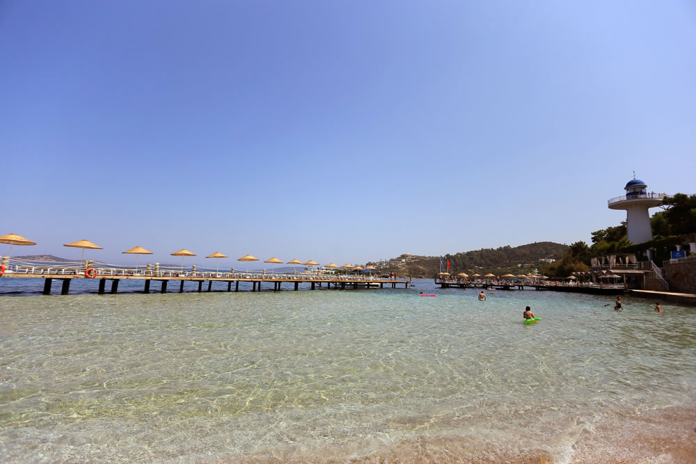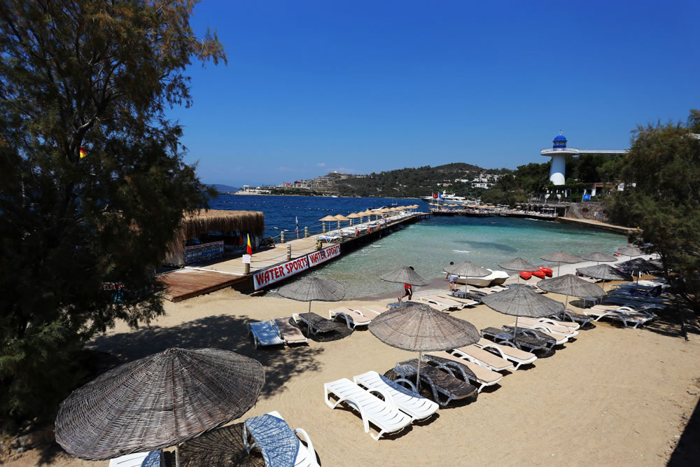 Písečnooblázková pláž s uměle vytvořeným pozvolným vstupem do moře (při vstupu drobné oblázky) přímo u hotelu. K dispozici také molo. Lehátka a slunečníky zdarma.