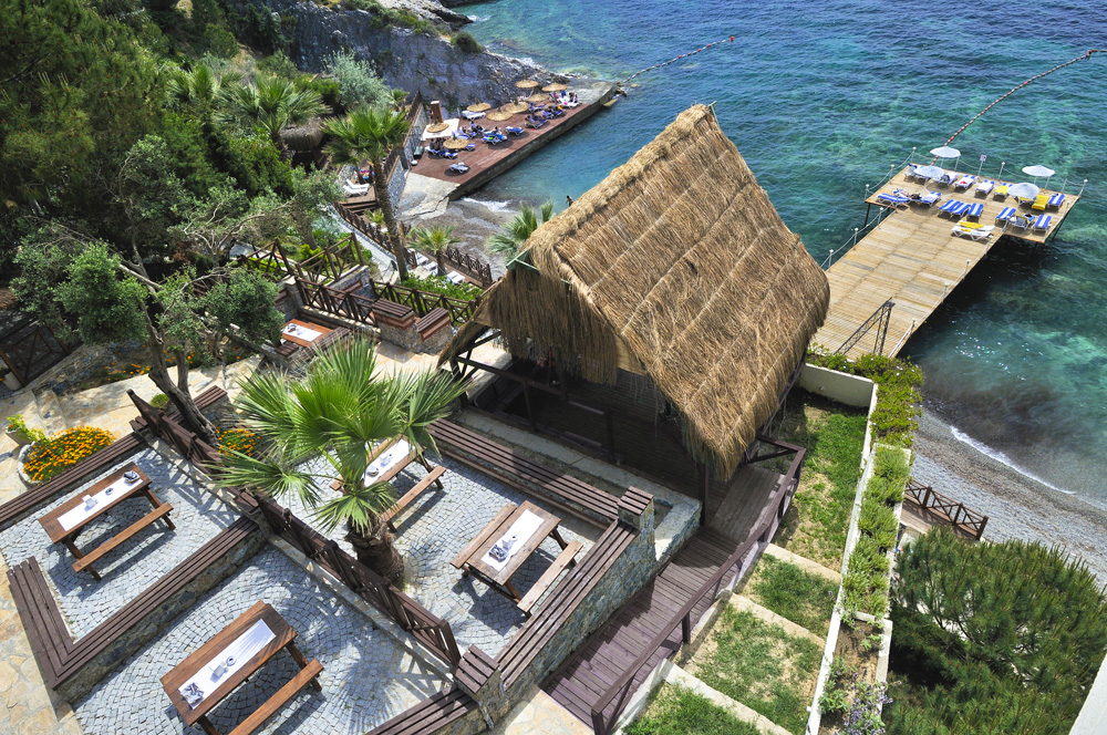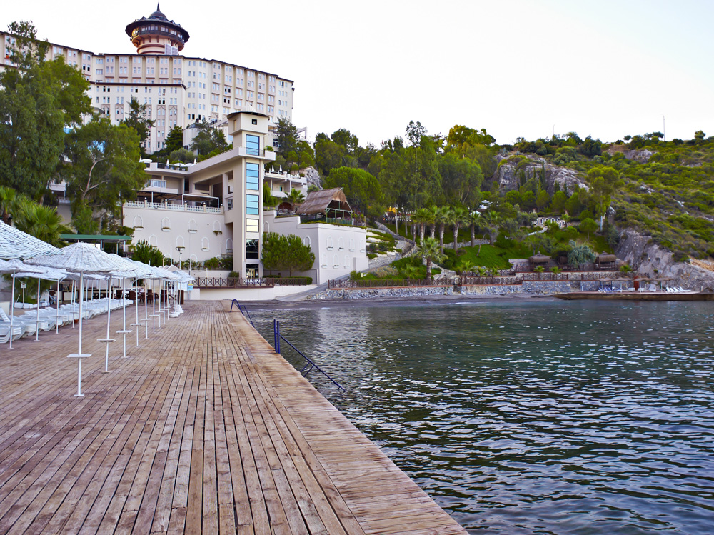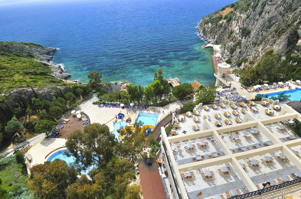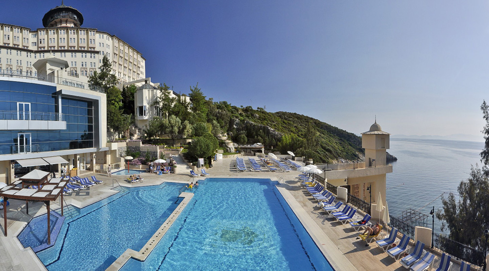Hotel postavený na skalnatém pobřeží s krásným výhledem na moře. Centrum Kusadasi cca 3,5 km, letiště cca 65 km.