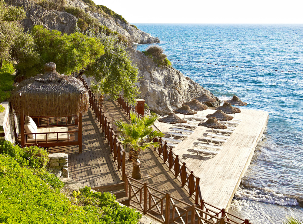 Menší písečnooblázková pláž přímo pod hotelem (pro vstup na pláž k dispozici výtah). Dvě mola na slunění s lehátky, slunečníky a osuškami zdarma.