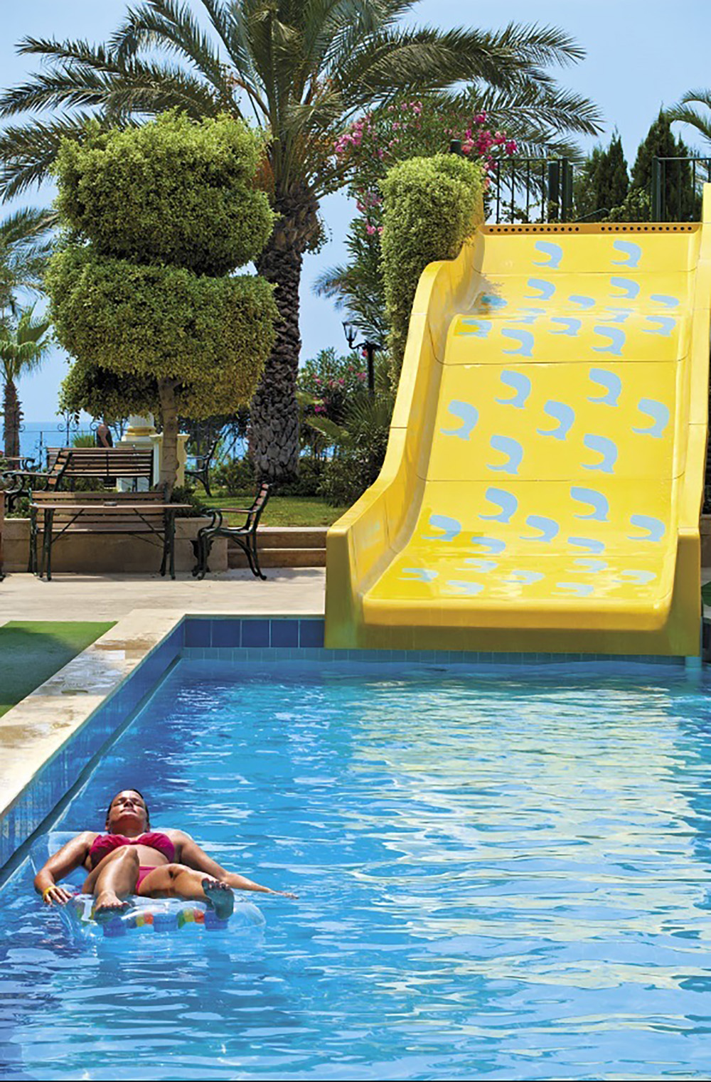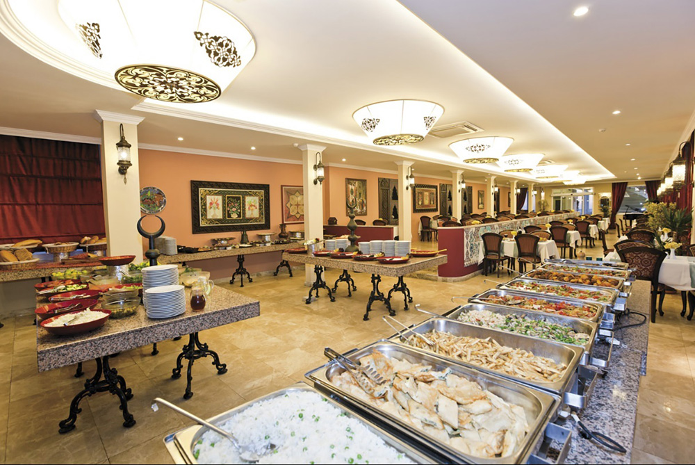 Vstupní hala s recepcí, TV místnost, hlavní restaurace, několik barů, knihovna a místnost na čtení, kadečnictví. V zahradě restaurace s výhledem na hrad a moře, bazén s terasou na slunění, lehátka a slunečníky zdarma, skluzavky.