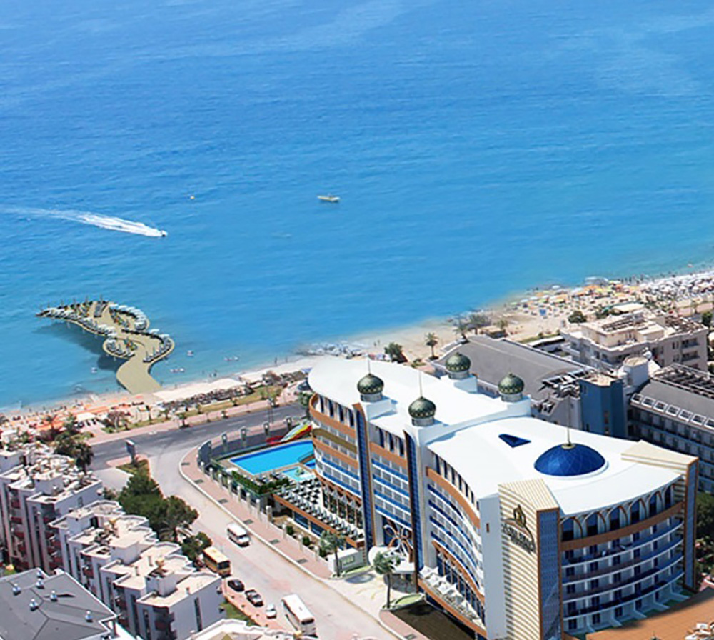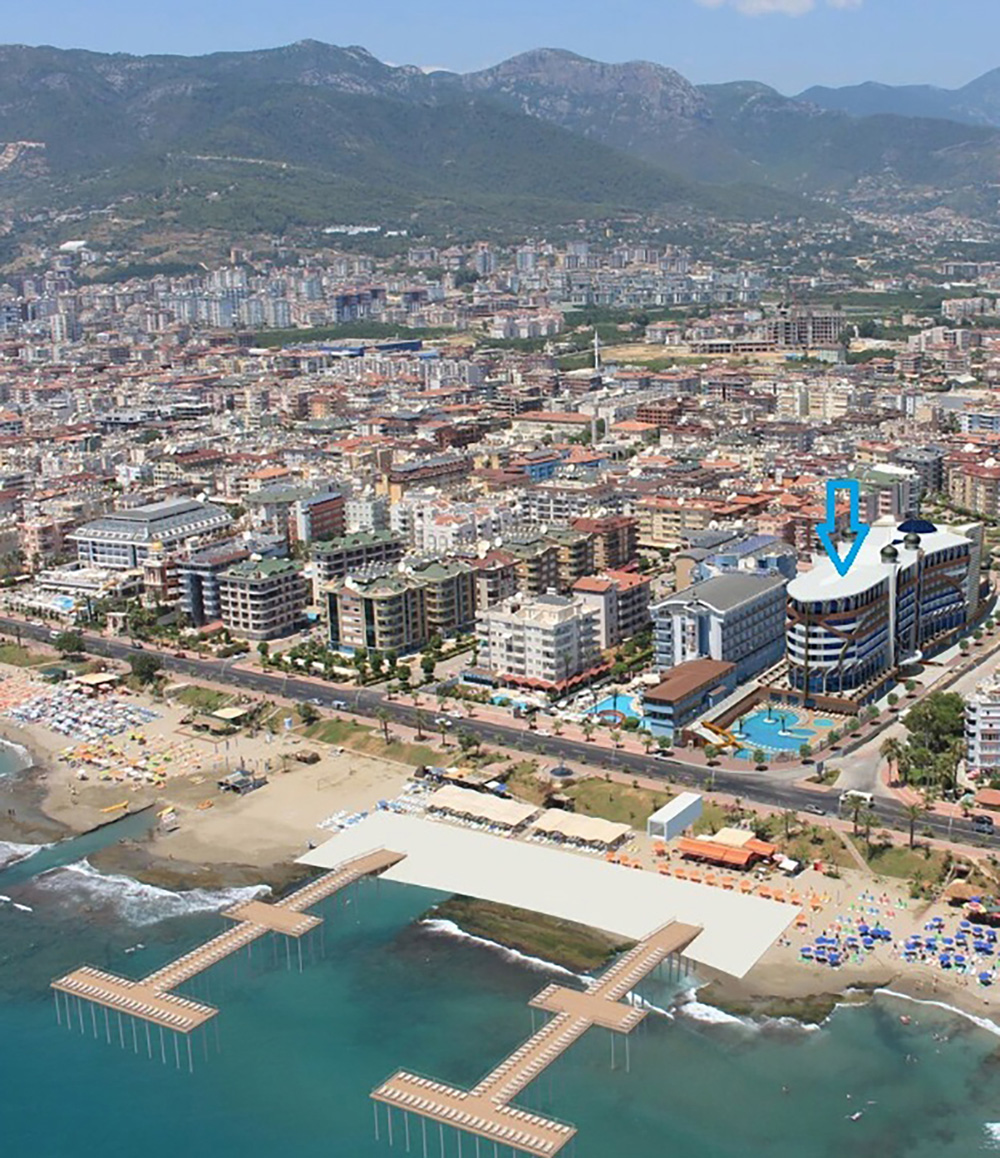 Od centra letoviska s možností nákupů, restaurací a barů cca 300m. Centrum města Alanya cca 3 km, letiště cca 130 km.