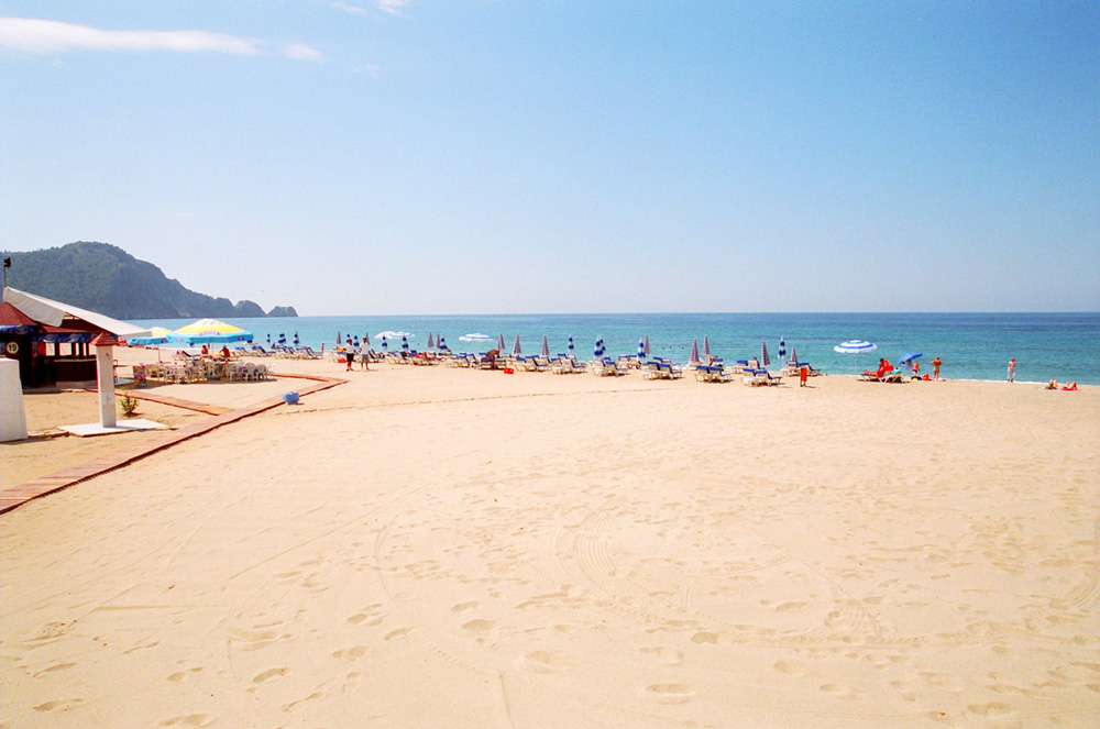 Písečná pláž Kleopatra oddělená od hotelu pobřežní komunikací a promenádou. Lehátka a slunečníky za poplatek.