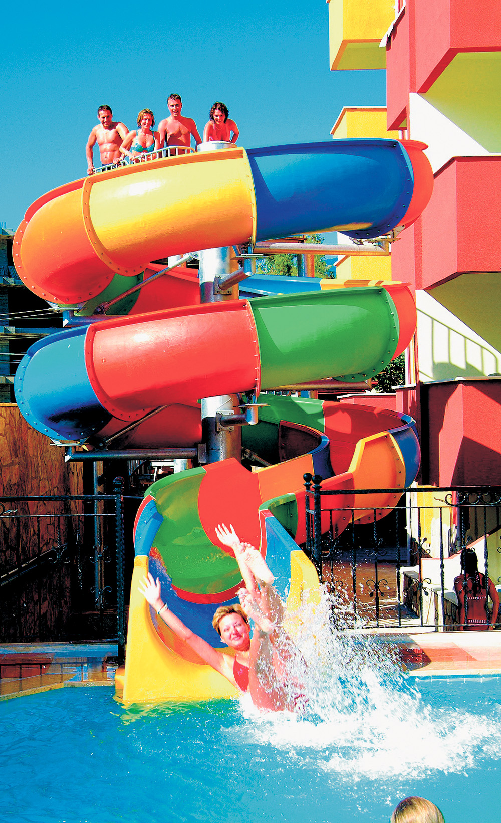 3 budovy, vstupní hala s recepcí, výtah, hlavní restaurace, bar, obchod se suvenýry, kadeřnictví, konferenční místnost. V zahradě bazén, menší bazén se skluzavkou, bar u bazénu, terasa na slunění s lehátky a slunečníky zdarma.