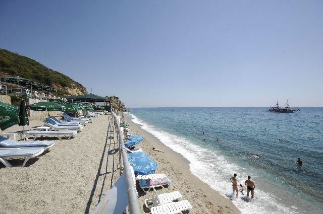 Písečná pláž s oblázky cca 100 m. Lehátka a slunečníky zdarma. Bar na pláži zdarma.