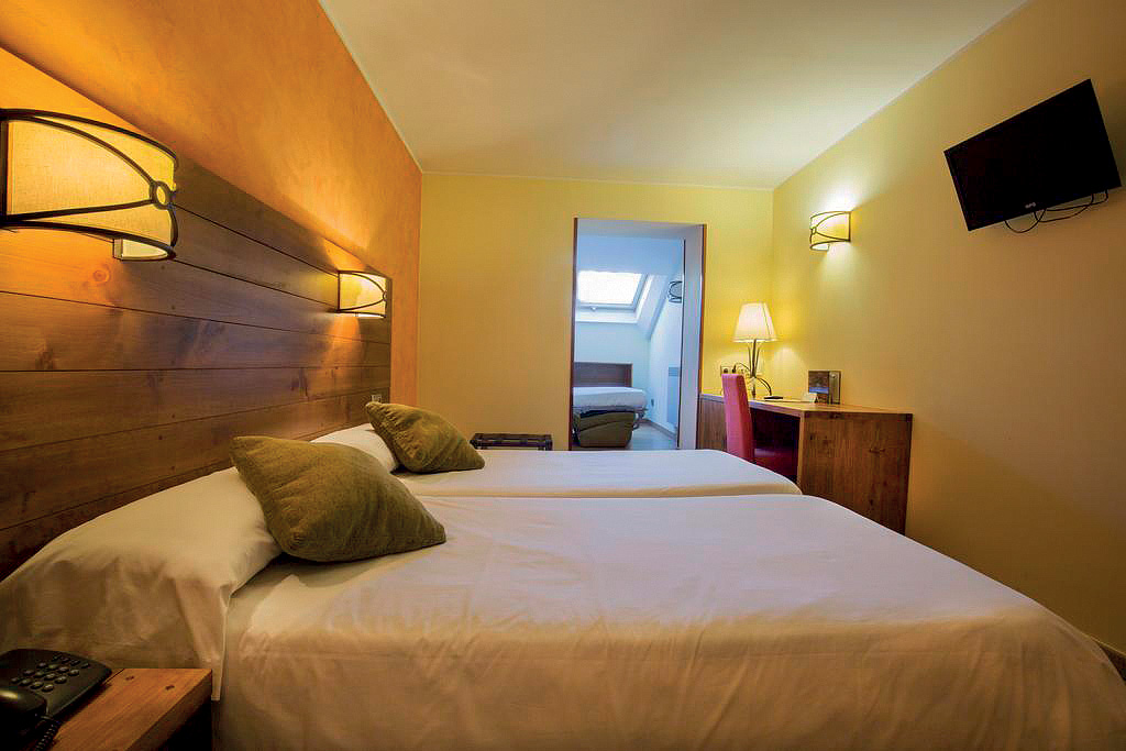 pokoj s manželskou postelí či 2 samostatnými lůžky a případně 1 dalším samostatným lůžkem či rozkládacím gaučem pro 2 osoby, sociální zařízení se sprchou či vanou