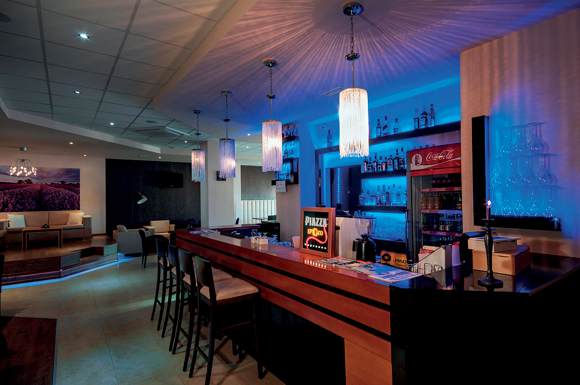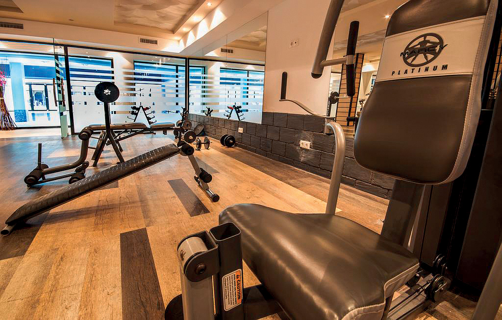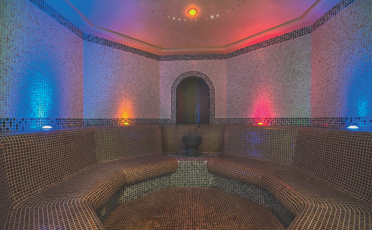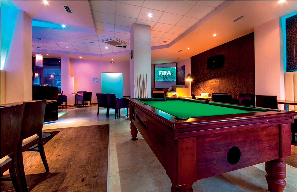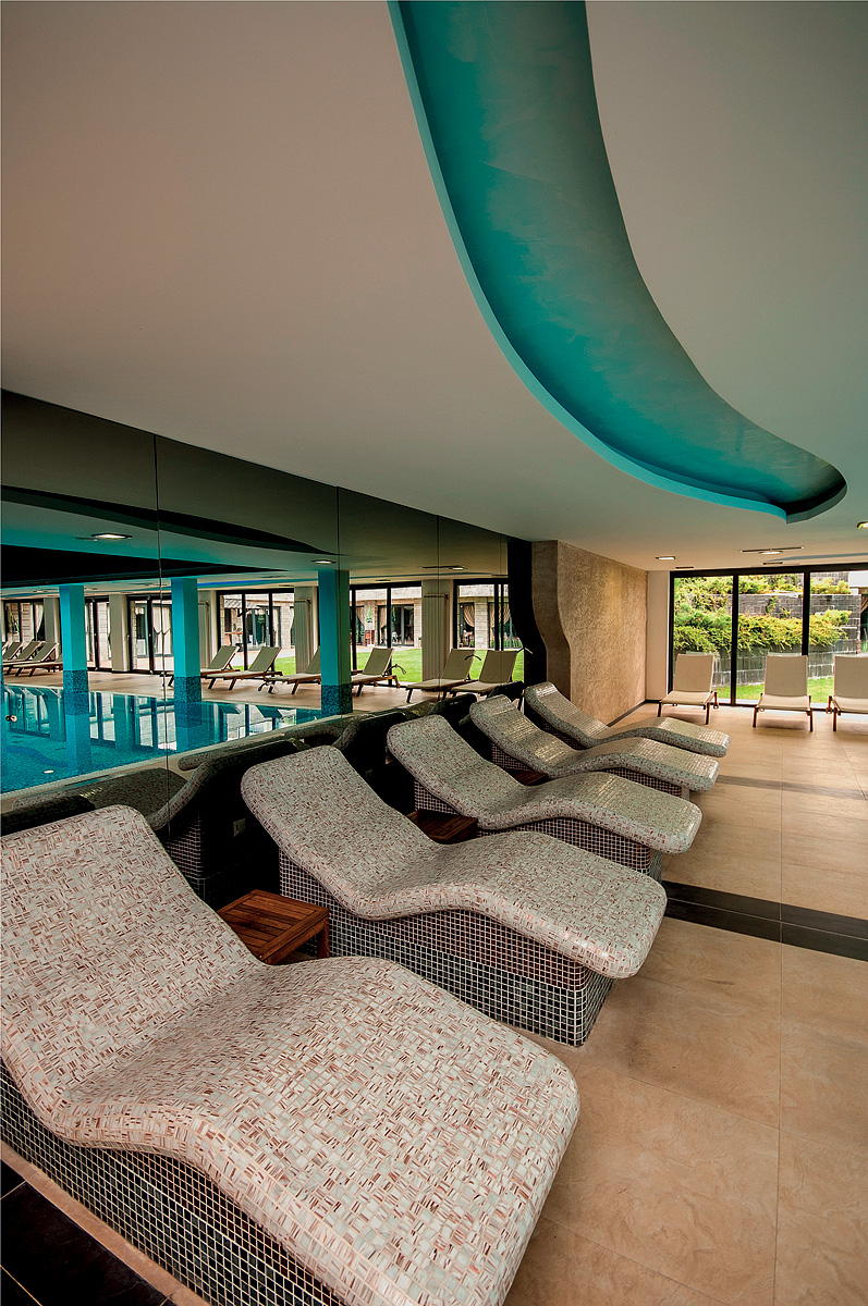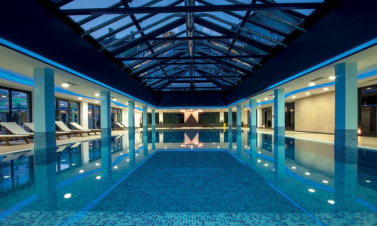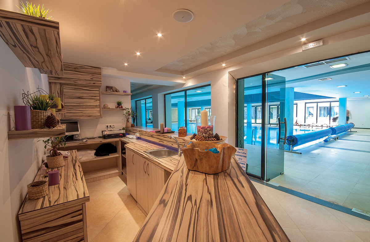 bazén s prosklenou střechou a lehátky, vířivka, finská sauna, pára, masáže*, kosmetické služby*, nadstandardně vybavená posilovna, biliár*