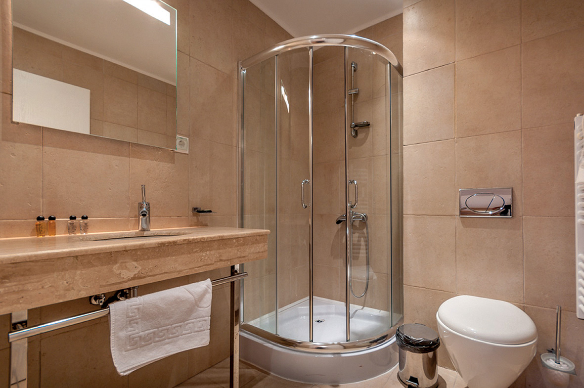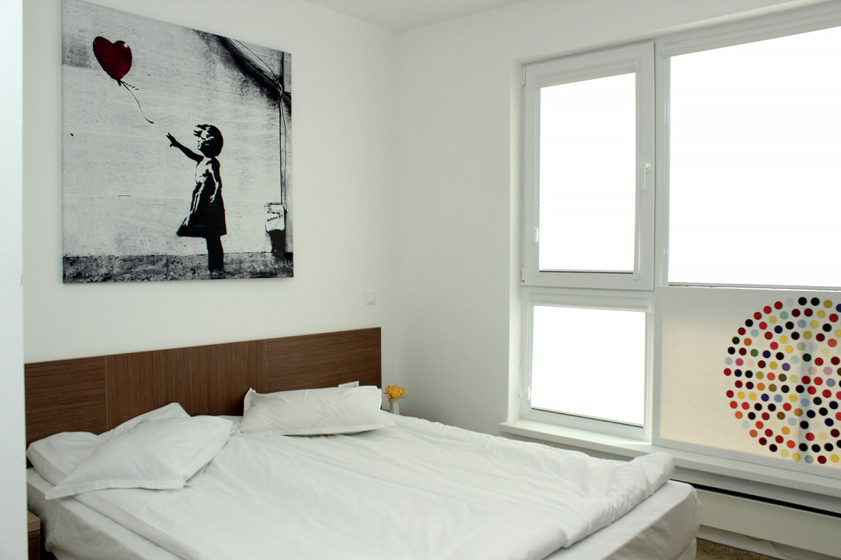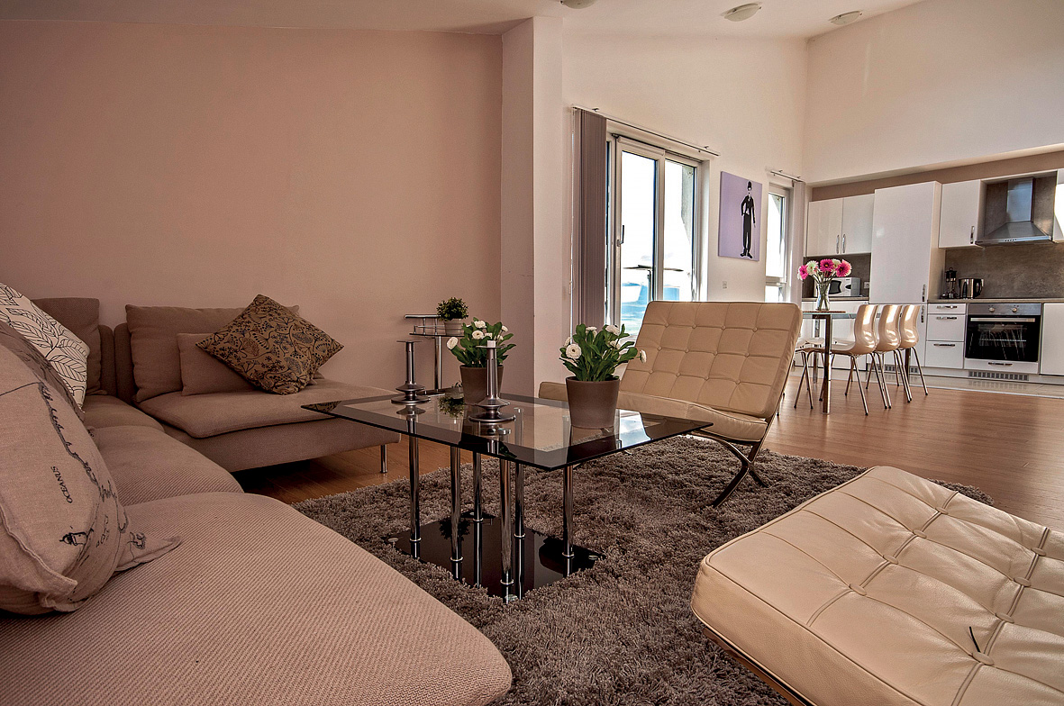 60 m² - 1 ložnice s manželskou postelí, 1 ložnice se 2 samostatnými lůžky, obývací pokoj s kuchyňským koutem a rozkládacím gaučem pro 1 dospělou osobu či až 2 děti do nedovršených 12 let, 2x sociální zařízení se sprchou či vanou (1x s přímým vstupem z ložnice), zřídka balkon