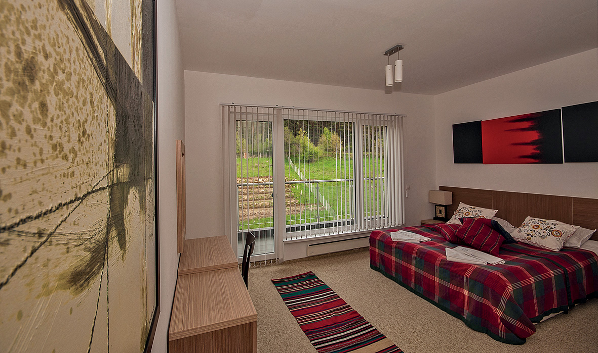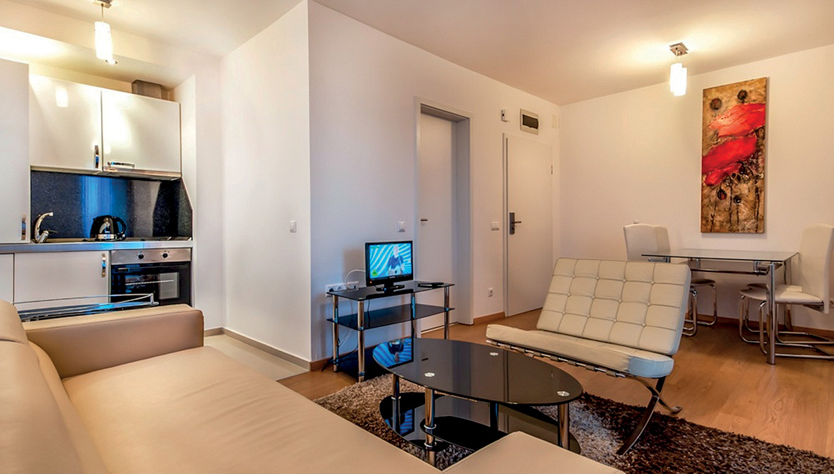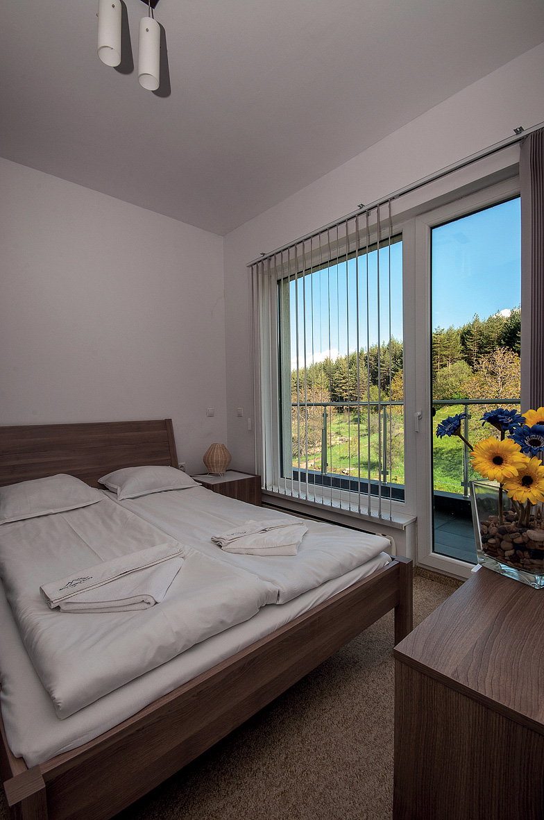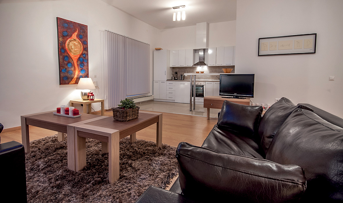 50 m² - 1 ložnice s manželskou postelí či 2 samostatnými lůžky, obývací pokoj s kuchyňským koutem a rozkládacím gaučem pro 1 dospělou osobu či 2 děti do nedovršených 12 let, sociální zařízení se sprchou či vanou, zpravidla balkon